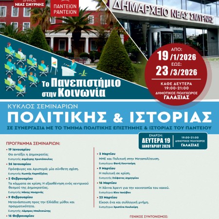 ΔΗΜΟΣ Ν. ΣΜΥΡΝΗΣ: Σεμινάρια Πολιτικής & Ιστορίας στον «Γαλαξία» σε συνεργασία με το Πάντειο