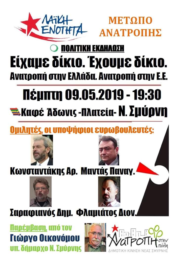 Πολιτική εκδήλωση με θέμα: «Είχαμε δίκιο. Έχουμε δίκιο. Ανατροπή στην Ελλάδα. Ανατροπή στην Ε.Ε.» διοργανώνει η Λαϊκή Ενότητα.