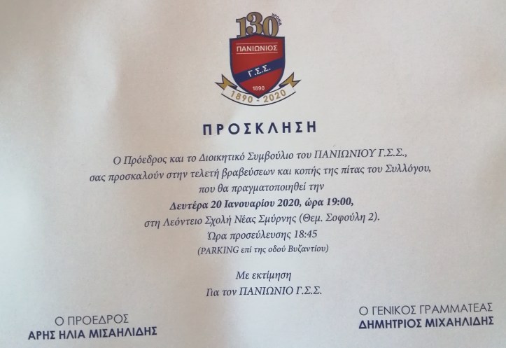 Τη Δευτέρα 20 Ιανουαρίου στις 19:00 το απόγευμα, θα πραγματοποιηθεί η κοπή πίτας του Πανιωνίου ΓΣΣ. Η εκδήλωση θα γίνει στον ίδιο χώρο που έγινε και πέρσι, στο Αμφιθέατρο της Λεοντείου Σχολής Ν. Σμύρνης.