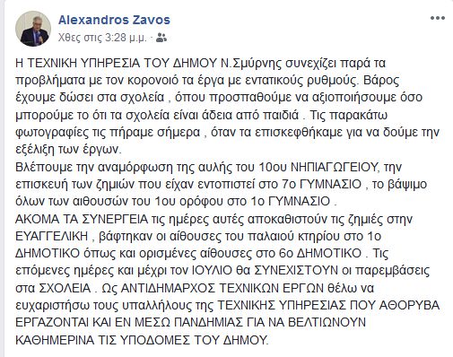 Τόσο ο Αντιδήμαρχος Τεχνικών Υπηρεσιών και ΄Εργων Αλέξανδρος Ζαβός, όσο και αρμόδιος για θέματα Παιδείας και Δια Βίου Μάθησης του Δήμου Πολύδωρος Συρίγος, με αναρτήσεις που έκαναν στη σελίδα τους στο Facebook ενημέρωσαν αναλυτικά για την πορεία αυτών των παρεμβάσεων, οι οποίες θα συνεχιστούν μέχρι τον Ιούλιο.