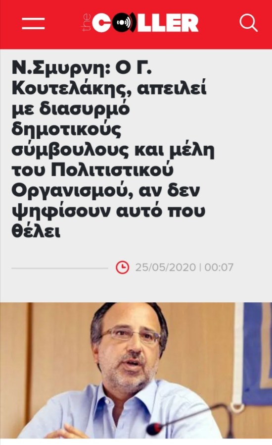 Με εκτενή άρθρα τους δύο μεγάλης αναγνωσιμότητας ιστοσελίδες, το thecaller.gr και το notia.gr κάνουν καυστική αναφορά σε ανάρτηση που έχει κάνει ο επικεφαλής της παράταξης «Νέα Σμύρνη Ποιότητα Ζωής», πρώην Δήμαρχος Γ. Κουτελάκης, για θέμα του Πολιτιστικού Οργανισμού του Δήμου Ν. Σμύρνης.