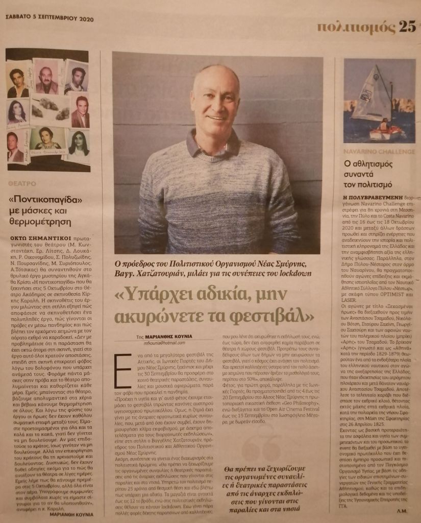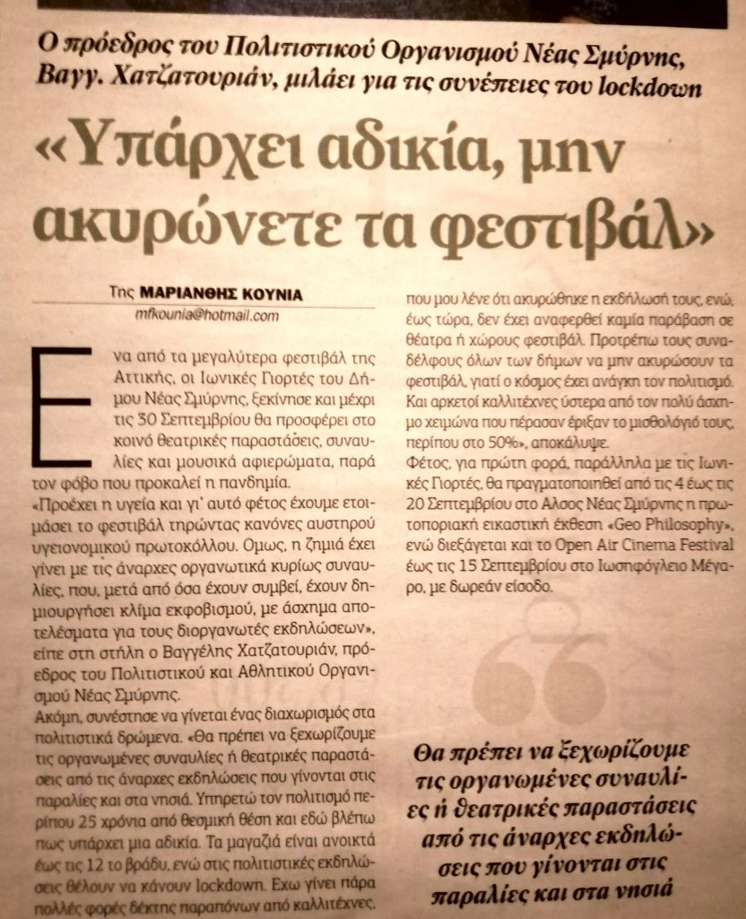 Η εφημερίδα «Παραπολιτικά» φιλοξένησε συνέντευξη του Προέδρου του Πολιτιστικού Οργανισμού Δήμου Ν. Σμύρνης Βαγγέλη Χατζατουριάν, σχετικά με τις φετινές «Ιωνικές Γιορτές», οι οποίες διεξάγονται κάτω από τις δύσκολες συνθήκες και μέτρα ασφαλείας που επιβάλλει η πανδημία του κορονοϊού.