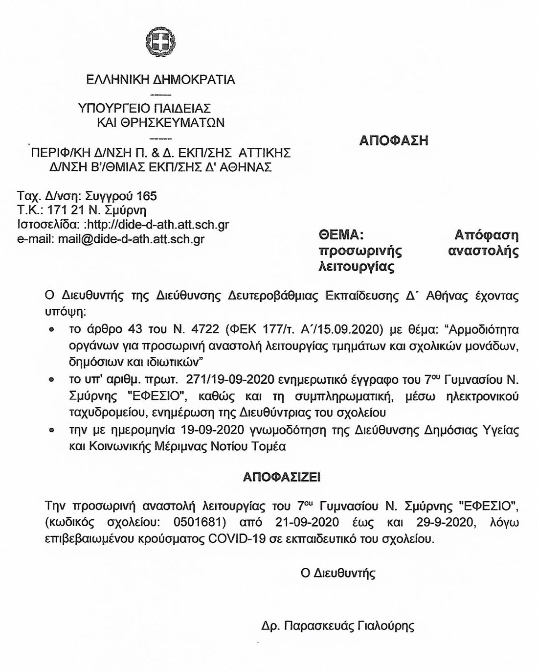 Σύμφωνα με απόφαση του Υπουργείου Παιδείας, το 7ο Γυμνάσιο θα παραμείνει κλειστό από Δευτέρα 21/9 έως και Τρίτη 29/9, ενώ αναμένεται και ενημέρωση για τα πιθανά επιπλέον μέτρα που θα ληφθούν. Ο Δήμος Νέας Σμύρνης ανακοίνωσε πως την Κυριακή 20/9 θα προχωρήσει σε απολύμανση της σχολικής μονάδας.