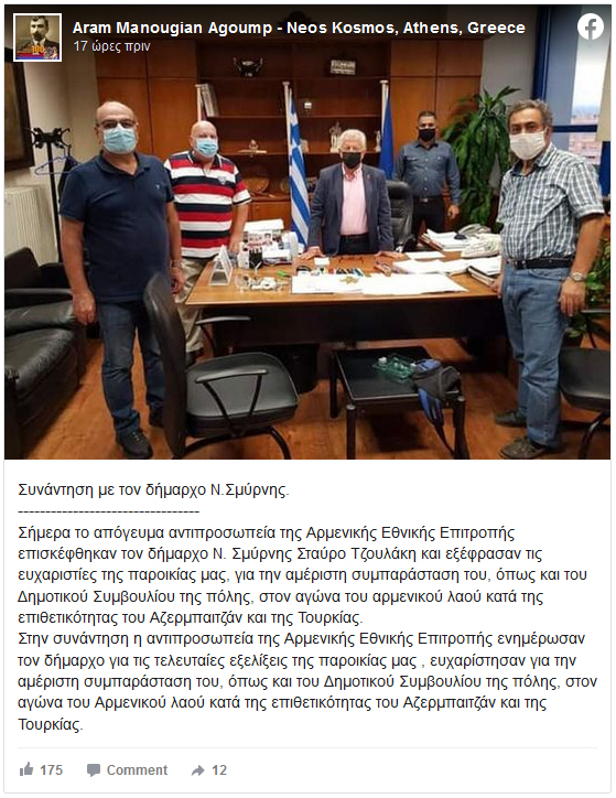 «Σήμερα το απόγευμα αντιπροσωπεία της Αρμενικής Εθνικής Επιτροπής επισκέφθηκαν τον δήμαρχο Ν. Σμύρνης Σταύρο Τζουλάκη και εξέφρασαν τις ευχαριστίες της παροικίας μας, για την αμέριστη συμπαράσταση του, όπως και του Δημοτικού Συμβουλίου της πόλης, στον αγώνα του αρμενικού λαού κατά της επιθετικότητας του Αζερμπαιτζάν και της Τουρκίας.
