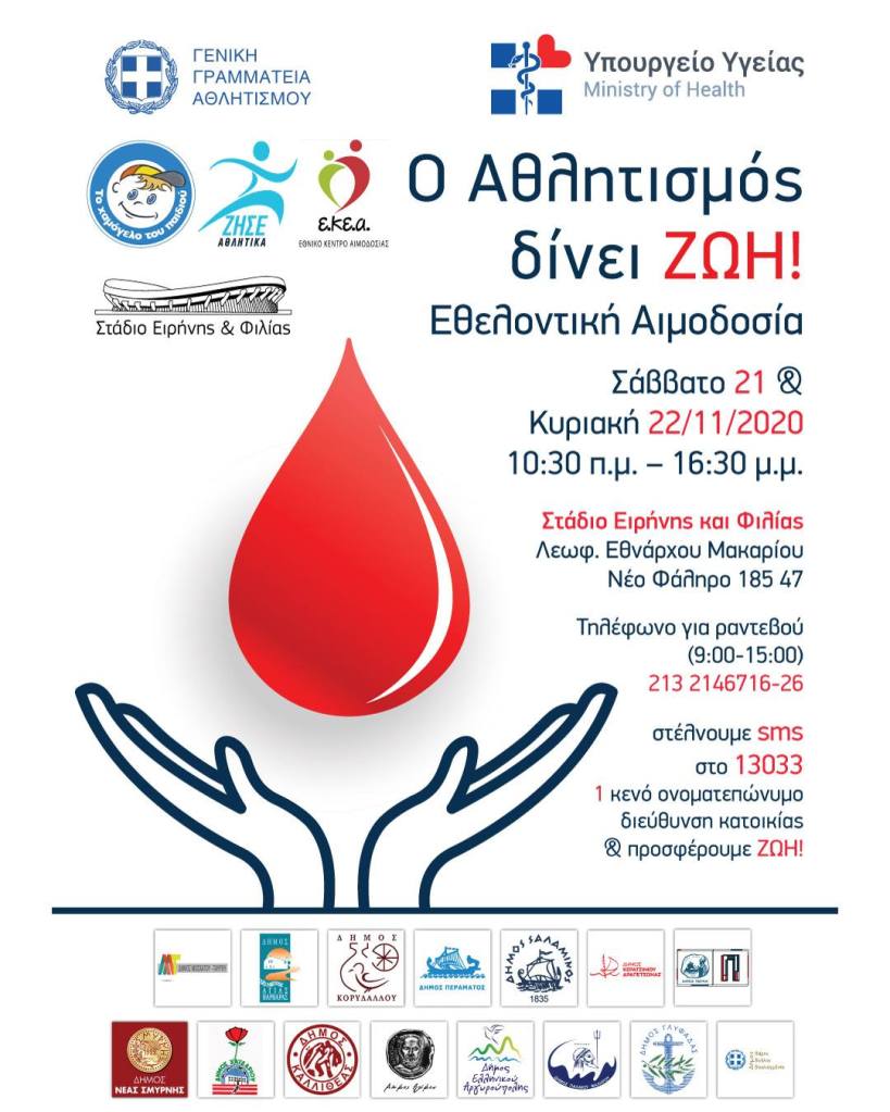 Το Σάββατο 21 και την Κυριακή 22 Νοεμβρίου και ώρες 10.30-16.30, θα πραγματοποιηθεί στο Στάδιο Ειρήνης και Φιλίας, εθελοντική αιμοδοσία, για την αντιμετώπιση των εποχιακών ελλείψεων αίματος, λόγω της πανδημίας COVID-19.