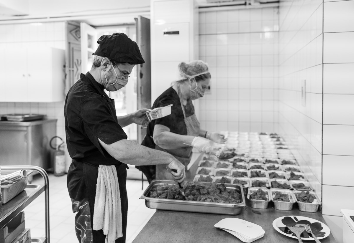 Στην κουζίνα απασχολούνται 2 μάγειρες και 2 βοηθητικοί υπάλληλοι από μέρους του Δήμου, όπου προετοιμάζουν και μαγειρεύουν καθημερινά.