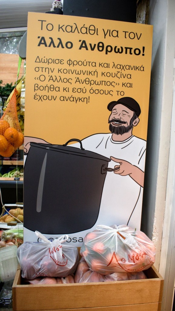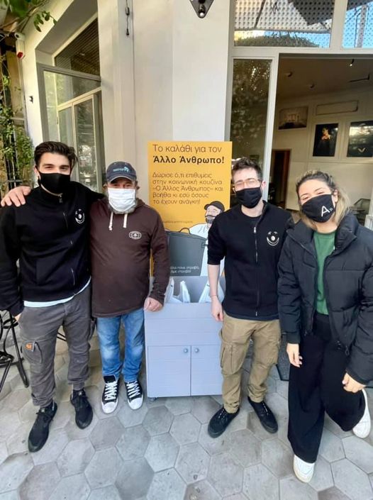 Έτσι θέλοντας να συμβάλουμε στο πάντα απίστευτο έργο αυτού του ανθρώπου, του Κωνσταντίνου Πολυχρονόπουλου, και σε όσους οφελούνται από αυτό, δημιουργήσαμε το <Καλαθι για τον Άλλον Άνθρωπο> ένα καλάθι με σκοπό να γεμίζει καθημερινά απ ότι μπορεί και θέλει να προσφέρει ο καθένας, λαχανικά – φρούτα – είδη πρώτης ανάγκης, με σκοπό να προσφέρονται μαζί με όσα δίνει το κατάστημα ανεξαρτήτως στην κοινωνική κουζίνα <Ο Άλλος Άνθρωπος> η οποία εδώ και εννιά χρόνια προσφέρει φαγητό σε άστεγους και άπορους της Αθήνας καθώς και σε όποιον χρειάζεται τη βοήθεια του.