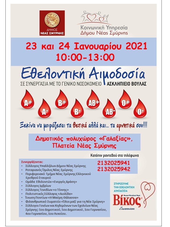 Η αιμοδοσία θα γίνει στον Πολυχώρο «Γαλαξίας», στην Κεντρική Πλατεία της Νέας Σμύρνης, το Σάββατο και τη Κυριακή 23 και 24 Ιανουαρίου 2021, από τις 10πμ έως τη 1μμ.Μόνο κατόπιν ραντεβού στα τηλέφωνα: 2132025941-2