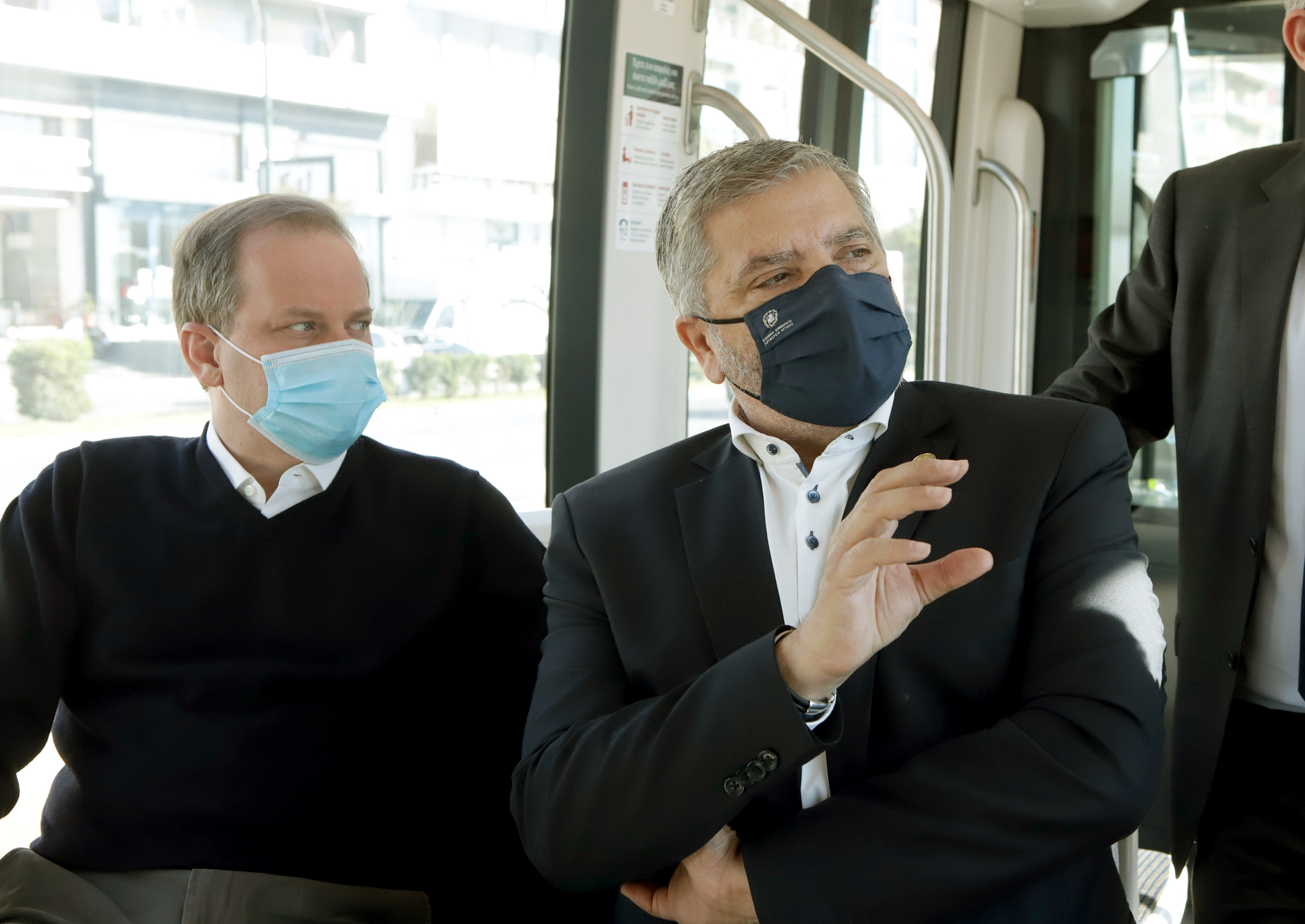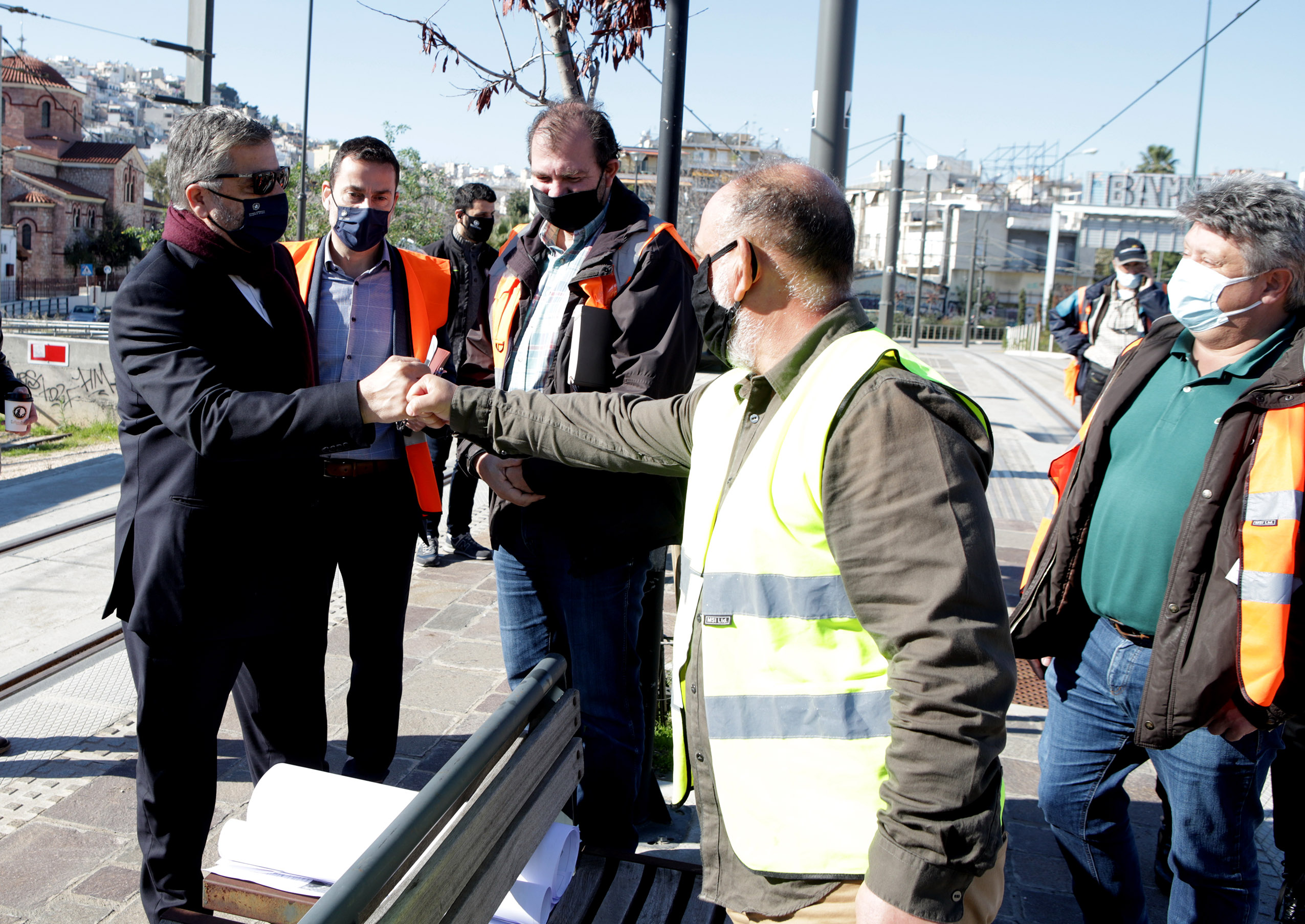 Το τμήμα της γραμμής του ΤΡΑΜ από την Αγία Σκέπη-Φάληρο έως τον κόμβο του ΣΕΦ, το οποίο ανακατασκευάστηκε πλήρως, με χρηματοδότηση της Περιφέρειας Αττικής, ύψους 5.5 εκ. ευρώ και παραδόθηκε στο επιβατικό κοινό, επιθεώρησαν σήμερα ο Υπ. Υποδομών και Μεταφορών Κ. Καραμανλής, ο Περιφερειάρχης Αττικής Γ. Πατούλης και ο υφ. Μεταφορών Γ. Κεφαλογιάννης, οι οποίοι επιβιβάστηκαν σε συρμό του τραμ και έκαναν τη συγκεκριμένη διαδρομή.