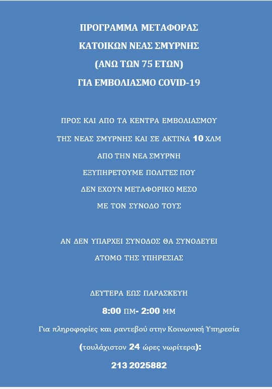 23 Φεβρουαρίου 202123 Φεβρουαρίου 2021 Epikaira ΔΗΜΟΣ Ν. ΣΜΥΡΝΗΣ: Μεταφορά κατοίκων της πόλης σε εμβολιαστικά κέντρα Ο Δήμος Νέας Σμύρνης ανακοίνωσε πως προσφέρει δωρεάν μεταφορά κατοίκων της πόλης, που δεν έχουν μεταφορικό μέσο, προς τα εμβολιαστικά κέντρα. Αναλυτικές οδηγίες, όπως αναρτήθηκαν από το Γραφείο Τύπου του Δήμου: Κοινοποιήστε: Στείλε ένα σύνδεσμο σε έναν φίλο(Ανοίγει σε νέο παράθυρο) Email Εκτύπωση(Ανοίγει σε νέο παράθυρο) Εκτύπωση Mοιραστείτε στο Facebook(Ανοίγει σε νέο παράθυρο) Facebook Μοιραστείτε στο LinkedIn(Ανοίγει σε νέο παράθυρο) LinkedIn Μοιραστείτε στο X(Ανοίγει σε νέο παράθυρο) Χ Μοιράσου στο WhatsApp(Ανοίγει σε νέο παράθυρο) WhatsApp Μου αρέσει! Φόρτωση... Related