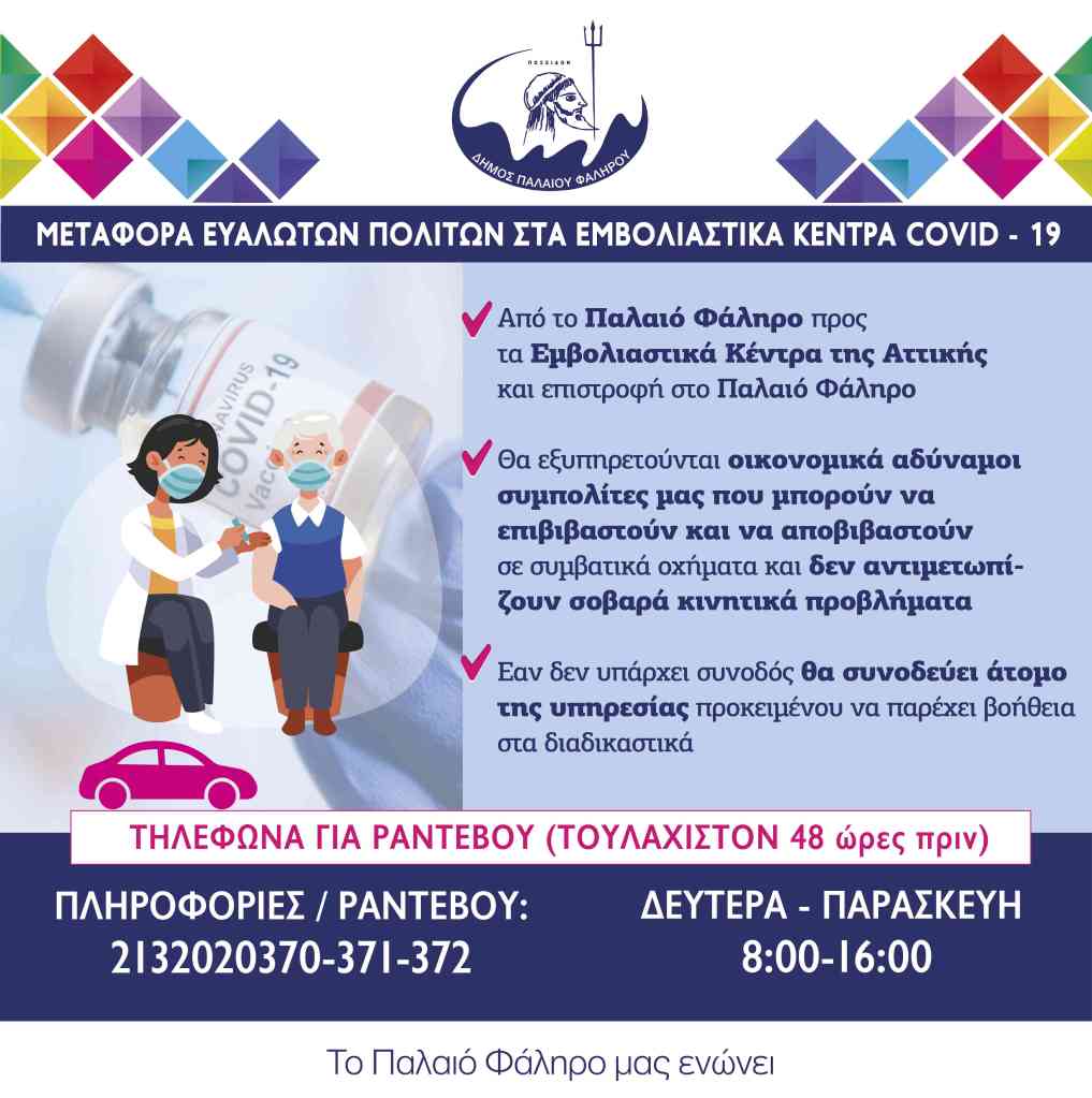 Για την μεταφορά ηλικιωμένων και ευάλωτων πολιτών στα εμβολιαστικά κέντρα covid-19, ώστε να εμβολιαστούν κατά του κορωνοϊού, μεριμνά ο Δήμος Παλαιού Φαλήρου από την Τρίτη 23/2/2021.