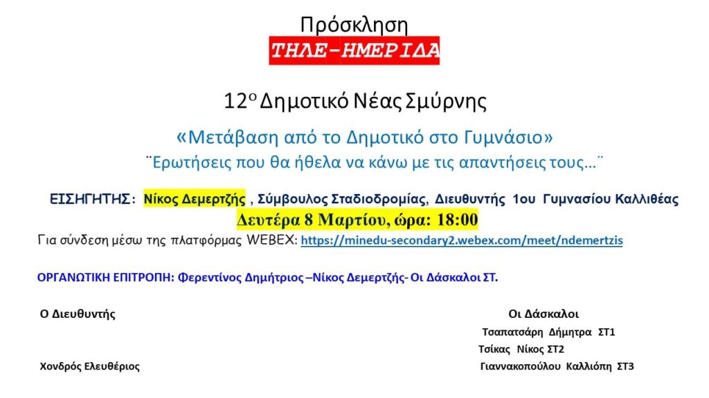 Το 12ο Δημοτικό Σχολείο Νέας Σμύρνης διοργανώνει τηλέ-ημερίδα τη Δευτέρα 8 Μαρτίου και ώρα 18:00 το απόγευμα. Θέμα της ημερίδας είναι: «Μετάβαση από το Δημοτικό στο Γυμνάσιο – Ερωτήσεις που θα ήθελα να κάνω με τις απαντήσεις τους…»