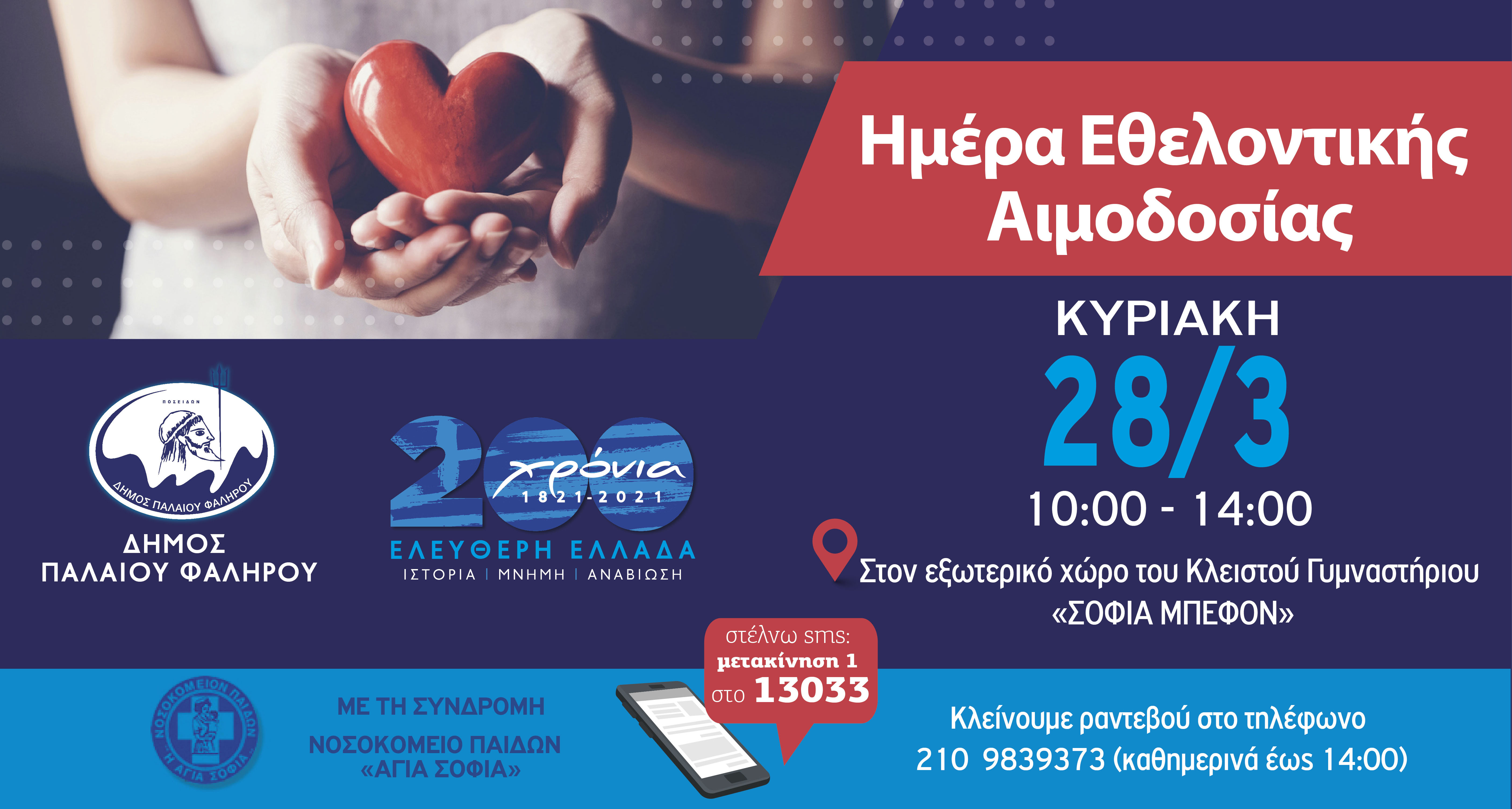 Ο Δήμος Παλαιού Φαλήρου στο πλαίσιο του εορτασμού των 200 χρόνων από το 1821 και με βαθύ συμβολισμό, διοργανώνει την Κυριακή 28 Μαρτίου 2021, από 10.00 έως 14.00, Εθελοντική Αιμοδοσία, στον εξωτερικό χώρο του Κλειστού Γυμναστήριου ΣΟΦΙΑ ΜΠΕΦΟΝ με τη συνδρομή του Νοσοκομείου Παίδων ΑΓΙΑ ΣΟΦΙΑ.
