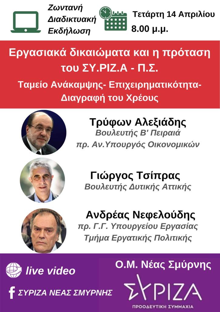 Η Ο.Μ. ΣΥΡΙΖΑ – Προοδευτική Συμμαχία Νέας Σμύρνης διοργανώνει την Τετάρτη 14/4, στις 8:00 μ.μ., ανοικτή Διαδικτυακή Εκδήλωση-Συζήτηση για τα εργασιακά δικαιώματα και την προγραμματική πρόταση του ΣΥ.ΡΙΖ.Α.-Προοδευτική Συμμαχία.