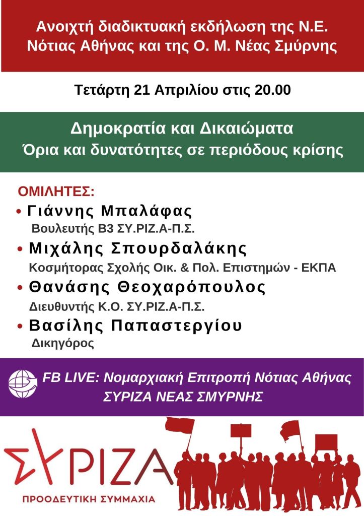 H Νομαρχιακή Επιτροπή Νότιας Αθήνας και η Οργάνωση Μελών Νέας Σμύρνης, διοργανώνουν την Τετάρτη 21 Απριλίου στις 8 μμ., διαδικτυακή εκδήλωση με θέμα: «Δημοκρατία και Δικαιώματα Όρια και δυνατότητες σε περιόδους κρίσης»