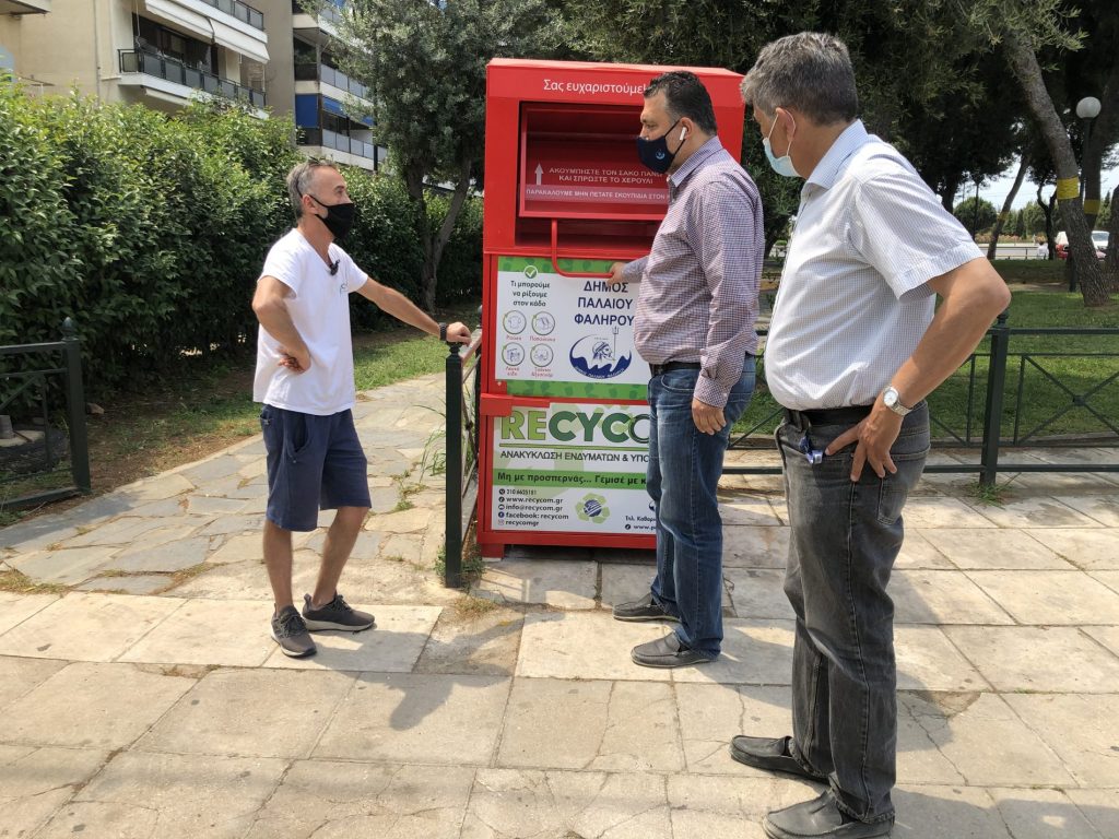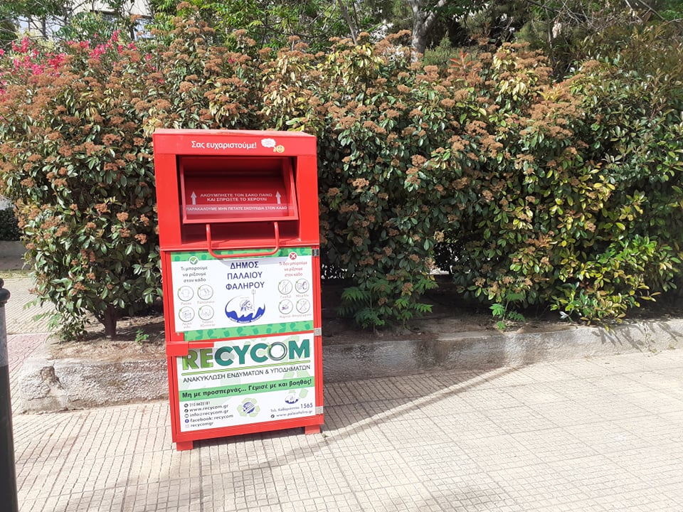Με στόχο τη μείωση των σύμμεικτων απορριμμάτων του Δήμου και την επαναχρησιμοποίηση/ανακύκλωση των ρούχων και των υλικών τους, ο Δήμος Παλαιού Φαλήρου προχώρησε στην τοποθέτηση κόκκινων κάδων ανακύκλωσης ρούχων, υποδημάτων, αξεσουάρ και λευκών ειδών σε συνεργασία με την εταιρία RECYCOM.