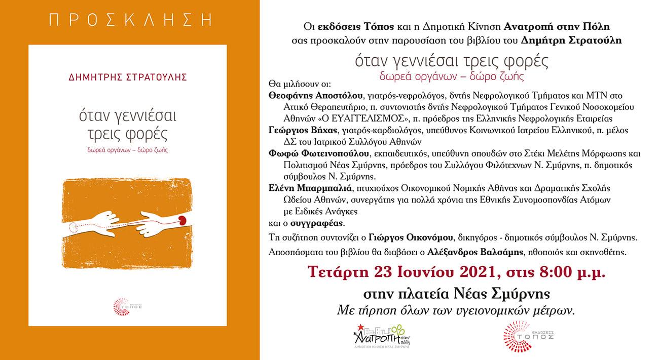 Στην εκδήλωση θα παρουσιαστεί το νέο βιβλίο του πρώην βουλευτή και υπουργού Δημήτρη Στρατούλη «Όταν γεννιέσαι τρεις φορές«, που έχει ως θέμα του τη δωρεά ανθρώπινων οργάνων.