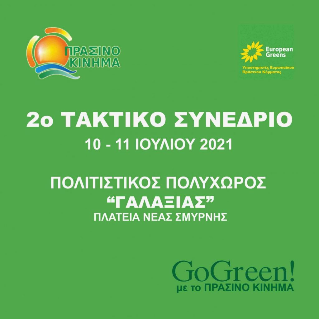 Το Πράσινο Κίνημα διοργανώνει το 2ο Τακτικό Συνέδριο στις 10-11 Ιουλίου στον Πολιτιστικό Πολυχώρο «Γαλαξίας» στην Κεντρική Πλατεία Νέας Σμύρνης.Το Συνέδριο θα πραγματοποιηθεί με αυτοπρόσωπη παρουσία 130 μελών συν 20 καλεσμένων που θα κάνουν χαιρετισμούς για να τηρηθεί η σχετική ΚΥΑ που έχει εκδώσει η κυβέρνηση σχετικά με την πανδημία.