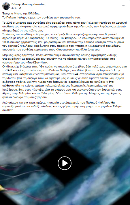 Ο Δήμαρχος Παλαιού Φαλήρου, με ανάρτηση του, αποχαιρέτησε τον Μίκη Θεοδωράκη. Όπως ανέφερε ο κ. Φωστηρόπουλος για τρεις ημέρες η σημαία στο Δημαρχείο της πόλης θα κυματίζει μεσίστια, σε ένδειξη πένθους για την απώλεια του μεγάλου συνθέτη.