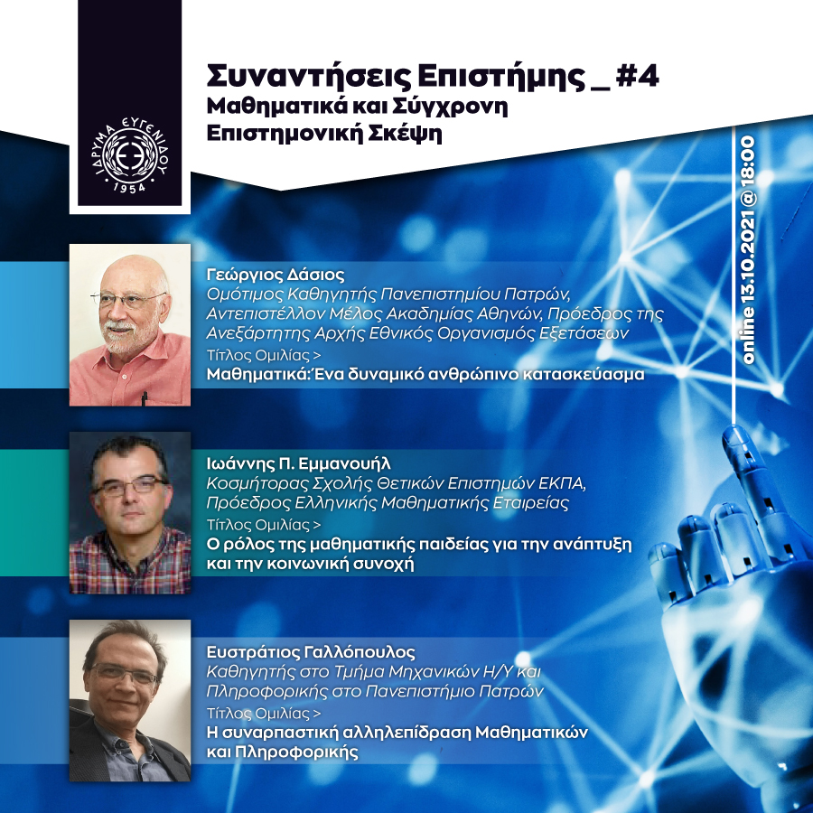 Το καλωσόρισμα στην διαδικτυακή αυτή συνάντηση έχει αναλάβει ο Δρ. Μάνος Κιτσώνας, Διευθυντής του Νέου Ψηφιακού Πλανηταρίου του Ιδρύματος Ευγενίδου, ενώ ο καθ. Γεώργιος Δάσιος θα ξεκινήσει με την ομιλία του: «Μαθηματικά: Ένα δυναμικό ανθρώπινο κατασκεύασμα». Ακολούθως ο καθ. Ιωάννης Εμμανουήλ θα μιλήσει για τον «Ρόλο της Μαθηματικής Παιδείας για την ανάπτυξη και την κοινωνική συνοχή» και ο καθ. Ευστράτιος Γαλλόπουλος, για την «Συναρπαστική αλληλεπίδραση Μαθηματικών και Πληροφορικής». Θα ακολουθήσει συζήτηση με το κοινό.