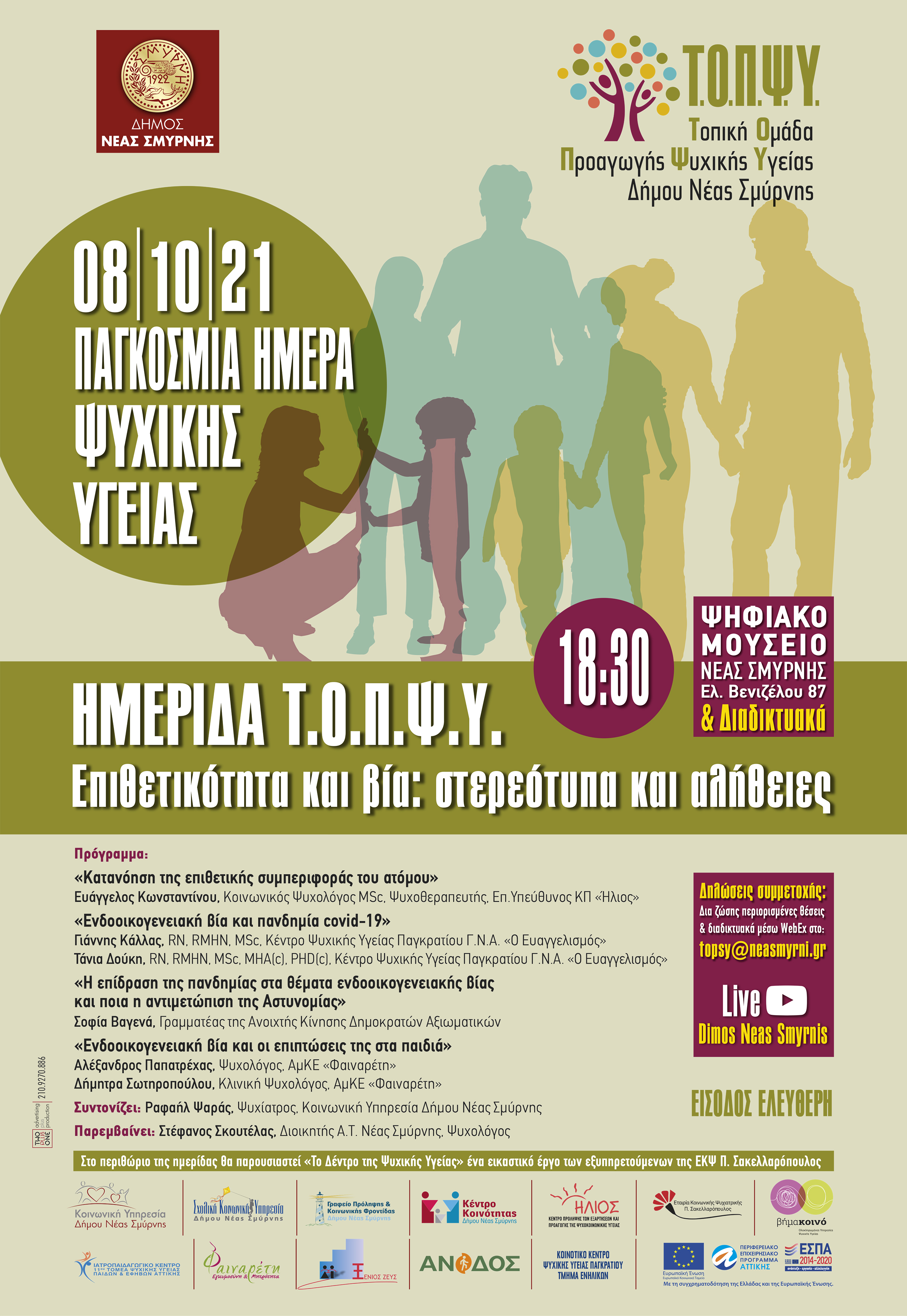 Συνεχίζοντας η Τοπική Ομάδα Προαγωγής Ψυχικής Υγείας (Τ.Ο.Π.Ψ.Υ) του Δήμου Ν. Σμύρνης την ενημέρωση των πολιτών πάνω σε επίκαιρα θέματα που απασχολούν την κοινωνία, πραγματοποίησε ημερίδα στο Ψηφιακό Μουσείο του δήμου Νέας Σμύρνης με θέμα «Επιθετικότητα και βία: Στερεότυπα και αλήθειες».