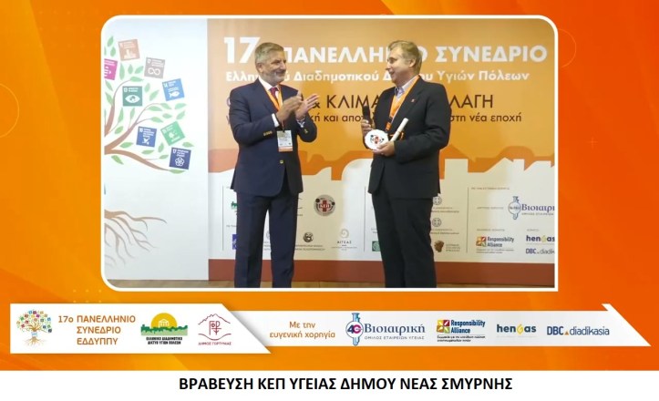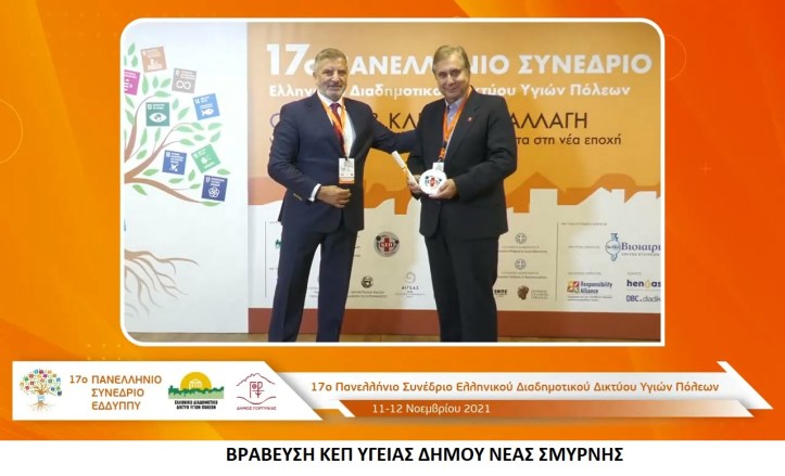 Σημαντική διάκριση για τις Κοινωνικές Δομές του Δήμου Νέας Σμύρνης, αποτέλεσε η βράβευση που έγινε κατά τη διάρκεια του 17ου Πανελληνίου Συνεδρίου του ΕΔΔΥΠΠΥ (Ελληνικό Διαδημοτικό Δίκτυο Υγιών Πόλεων Προαγωγής Υγείας) του Παγκόσμιου Οργανισμού Υγείας, με θέμα «COVID – 19 και Κλιματική Αλλαγή», το οποίο διεξήχθη στα Λαγκάδια Γορτυνίας με μεγάλη συμμετοχή και επιτυχία.