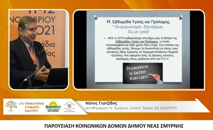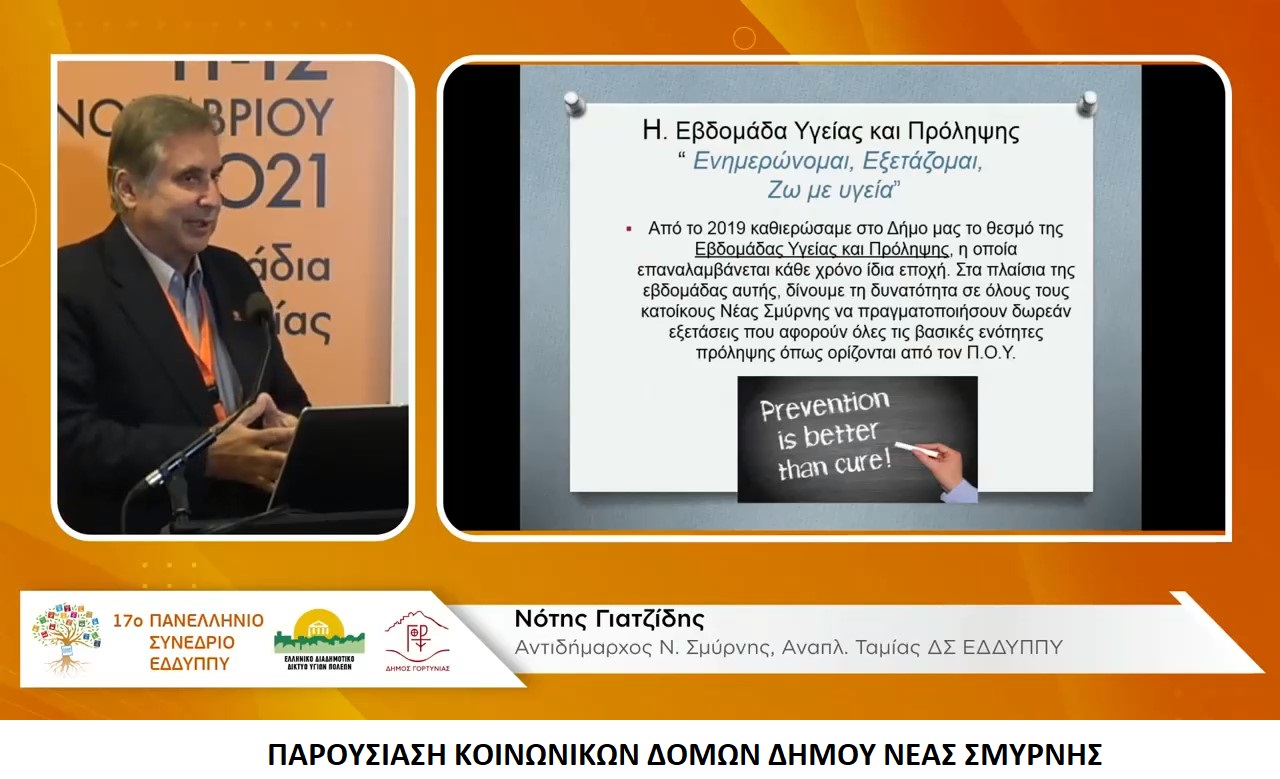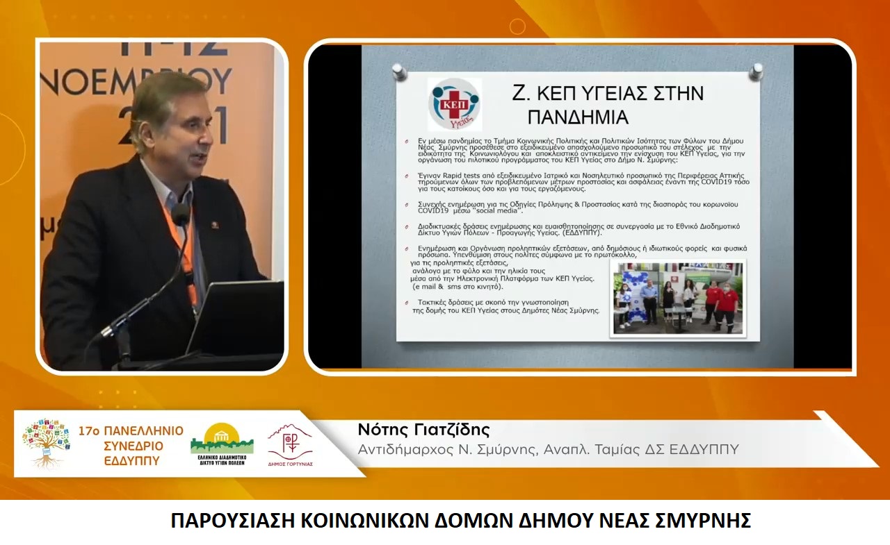 Το Δήμο Νέας Σμύρνης εκπροσώπησε ο Αντιδήμαρχος Κοινωνικής Πολιτικής, Υγείας και Αλληλεγγύης και Μέλος του Διοικητικού Συμβουλίου του ΕΔΔΥΠΠΥ Παναγιώτης Γιατζίδης, ο οποίος παρουσίασε αναλυτικά τις Κοινωνικές Δομές Υγείας και Πρόληψης στην Πανδημία, καθώς και τις δράσεις του ΚΕΠ Υγείας του Δήμου.