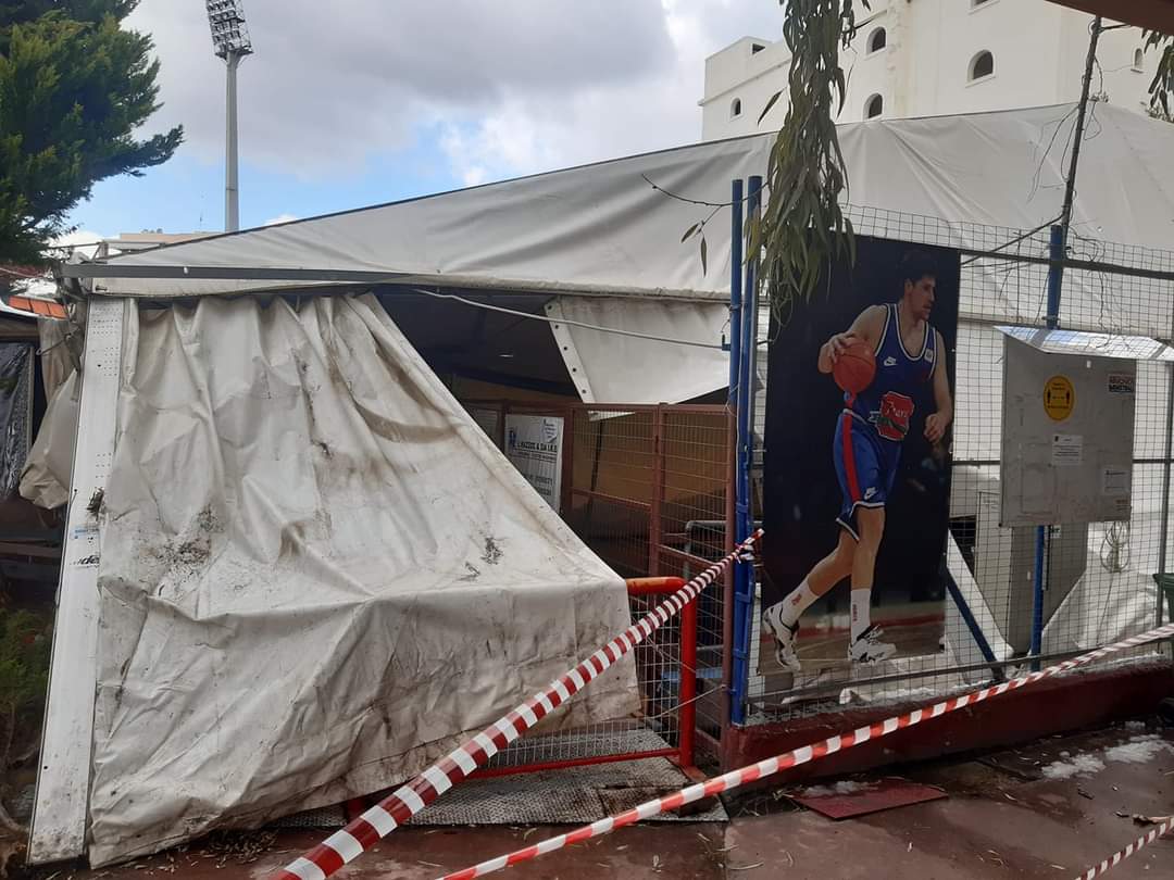 Η τέντα που καλύπτει το προπονητικό γήπεδο του μπάσκετ υποχώρησε και κατέρρευσε μερικώς από το βάρος του χιονιού, ενώ και οι υπόλοιπες εγκαταστάσεις έχουν υποστεί σημαντικές φθορές.