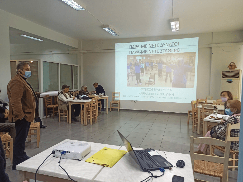 Το πρόγραμμα Otago ήδη εφαρμόσθηκε με μεγάλη επιτυχία στα μέλη των Α΄ & Β’ ΚΑΠΗ. Κατόπιν τούτου ήταν η σειρά των μελών του Γ΄ ΚΑΠΗ να εκπαιδευτούν και να τύχουν της ωφέλειας του προγράμματος. Η παρουσίαση του Προγράμματος έγινε από την υπεύθυνη Φυσικοθεραπεύτρια των Δημοτικών Ιατρείων του Δήμου κα Καριαμπά Ευφροσύνη, Instructor, Otago Exercise Program (OEP), στο χώρο του Γ΄ ΚΑΠΗ.