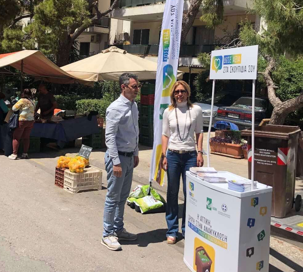 Η Αντιπεριφερειάρχης Νοτίου Τομέα Αθηνών, Δήμητρα Νάνου, επισκέφθηκε με τον Αντιδήμαρχο Καθαριότητας & Ανακύκλωσης του Δήμου Νέας Σμύρνης, Γιώργο Κρικρή, τη λαϊκή αγορά στην οδό Μεγάλου Αλεξάνδρου, στη Νέα Σμύρνη, στα πλαίσια του προγράμματος ανακύκλωσης “Δώσε Αξία στα σκουπίδια σου”