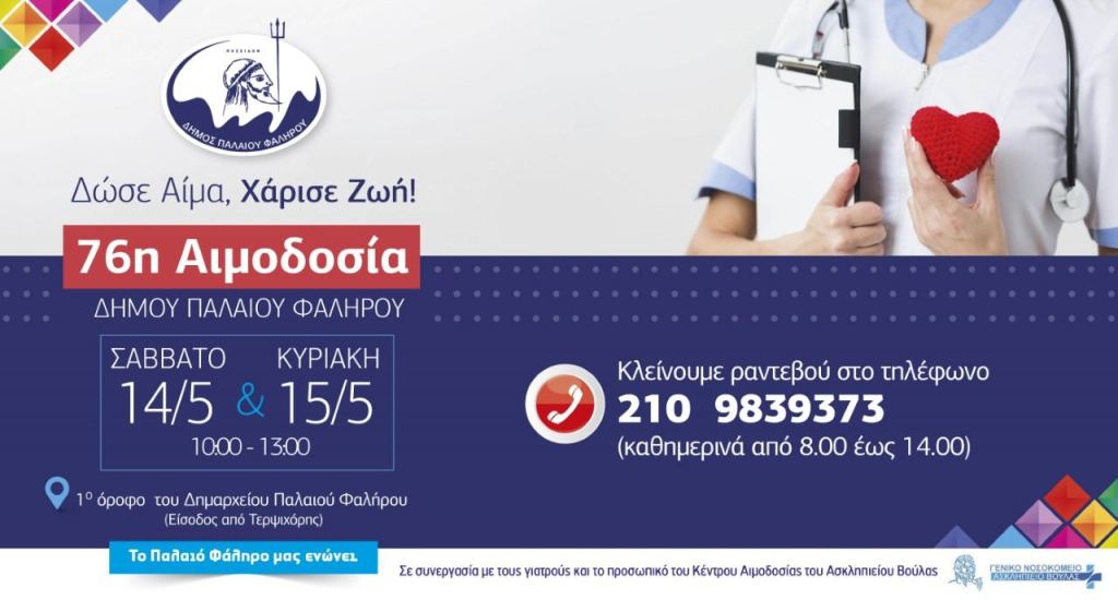 Ο Δήμος Παλαιού Φαλήρου σε συνεργασία με τους γιατρούς και το προσωπικό του Κέντρου Αιμοδοσίας του Ασκληπιείου Βούλας, διοργανώνει την 76η Εθελοντική Αιμοδοσία του,