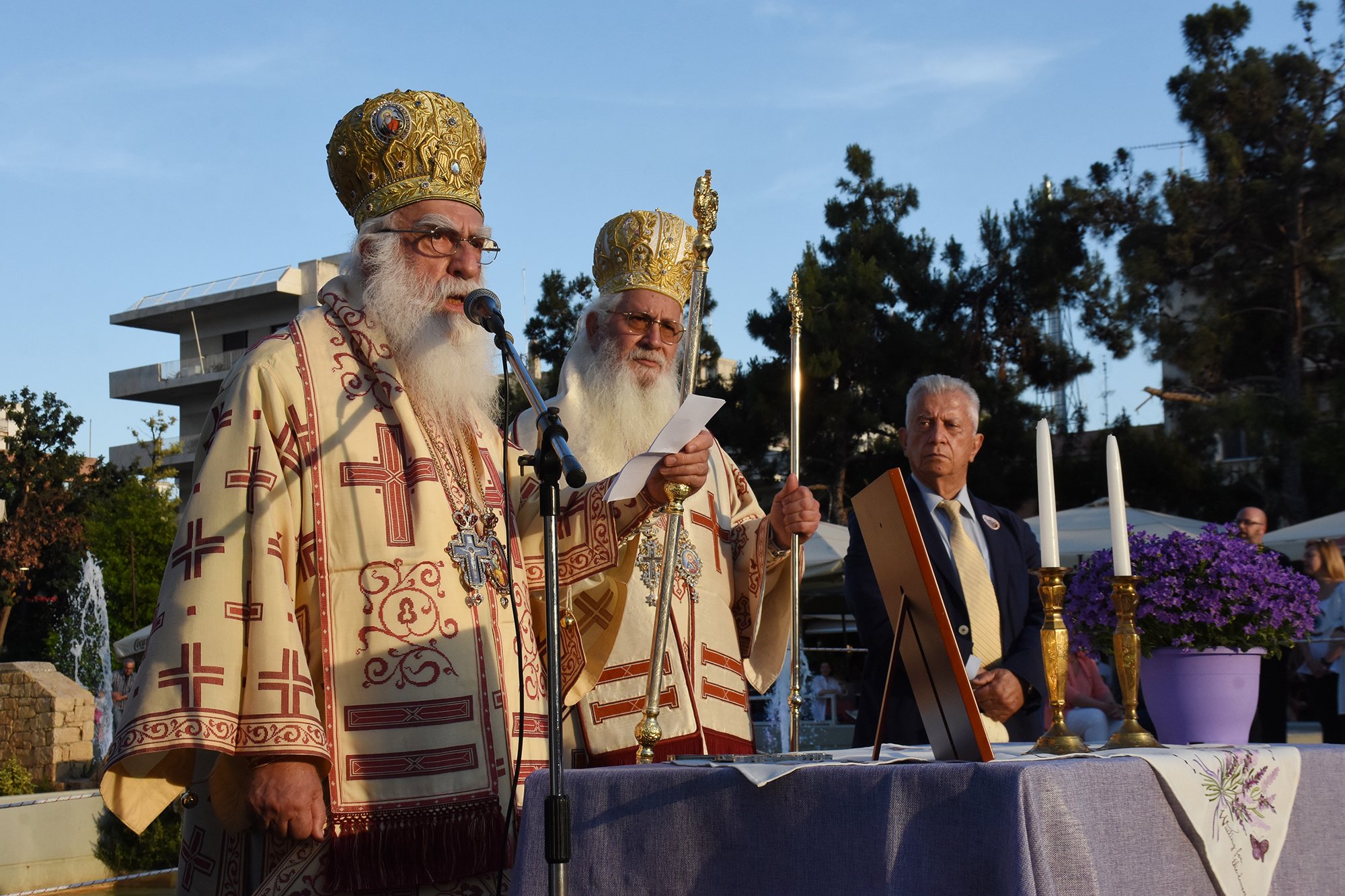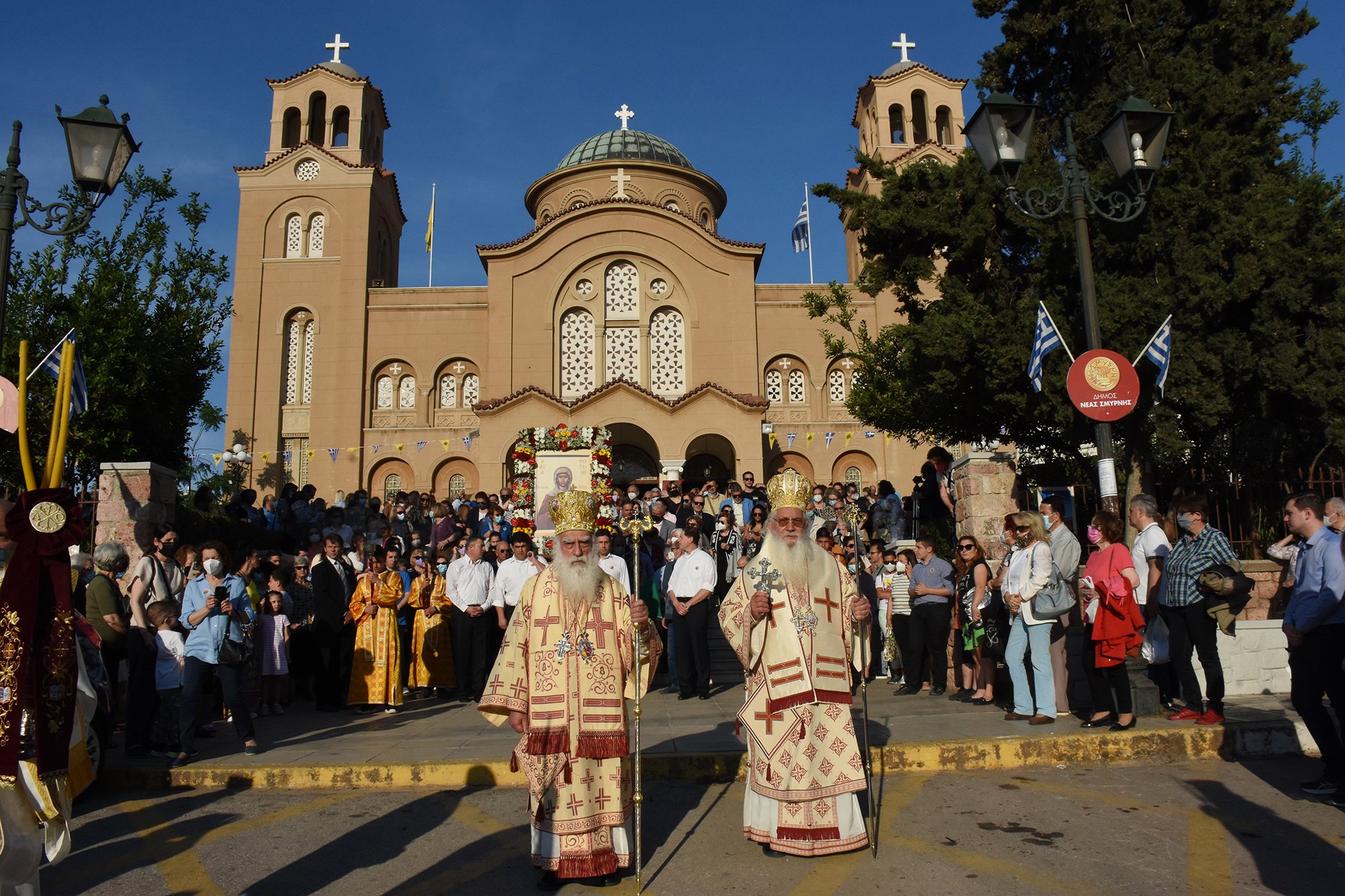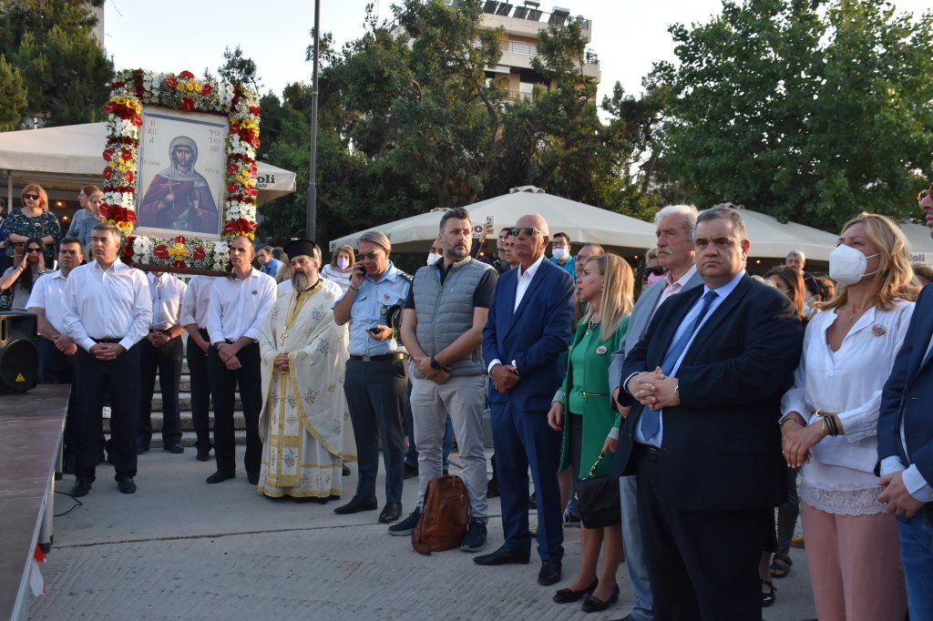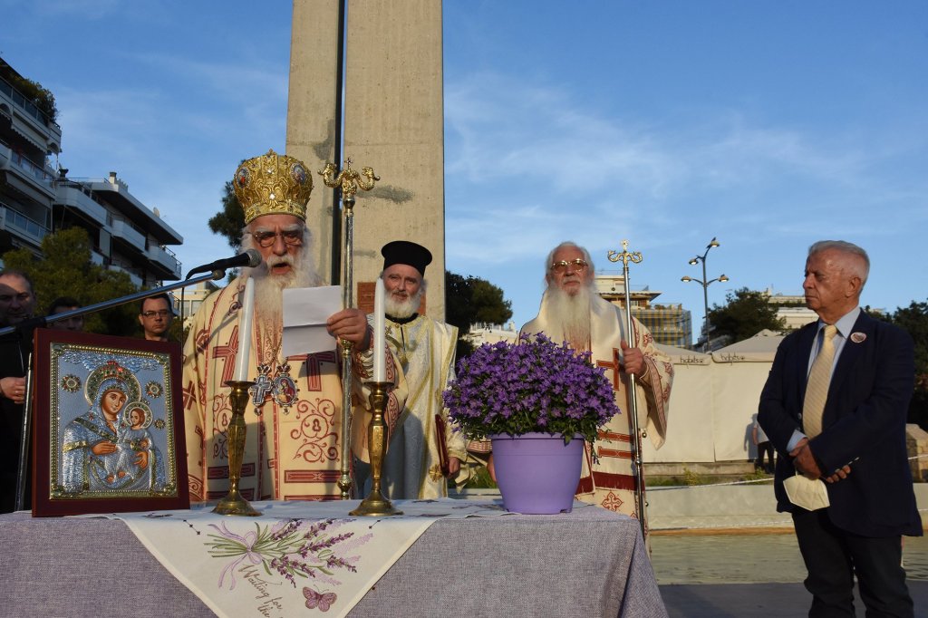 Στην κεντρική Πλατεία της πόλης αναπέμφθηκε ἡ καθιερωμένη δέηση και ο Μητροπολίτης Νέας Σμύρνης κ. Συμεών, παρουσία του Δημάρχου Σταύρου Τζουλάκη, απηύθυνε προς το λαό χαιρετισμό τονίζοντας μεταξύ άλλων: