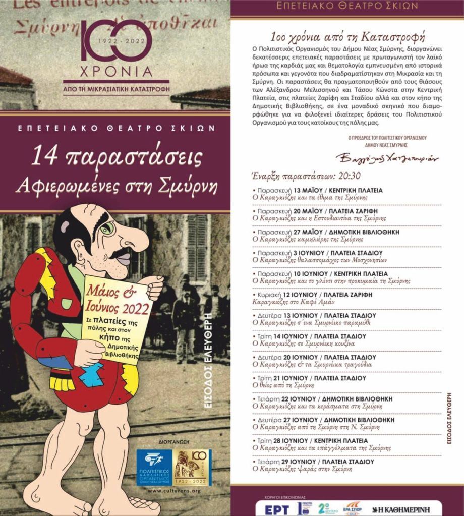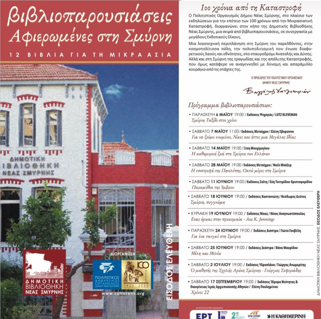 Με μία σειρά από εκδηλώσεις, δρώμενα και δράσεις, ο Δήμος Νέας Σμύρνης φέρνει μνήμες από τον ξεριζωμό του Ελληνισμού και τη Σμύρνη του 1922, με αφορμή τα 100 χρόνια από την Μικρασιατική Καταστροφή. Οι εκδηλώσεις έχουν ήδη ξεκινήσει, θα συνεχιστούν τον Ιούνιο-Ιούλιο και θα κορυφωθούν με τις Ιωνικές Γιορτές το Σεπτέμβριο-Οκτώβριο.
