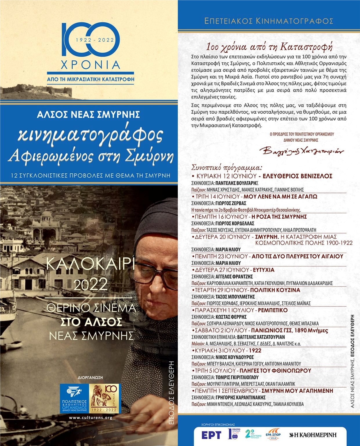 «Οι συνεργάτες μου κι εγώ είχαμε την έμπνευση εδώ και πολλούς μήνες, στη φετινή μεγάλη επέτειο του Ελληνισμού για τα 100 χρόνια από την Καταστροφή της Σμύρνης να δημιουργήσουμε ένα ακόμα γεμάτο καλλιτεχνικό πρόγραμμα- Φεστιβάλ στο Άλσος της πόλης μας στην πιο όμορφη περίοδο του καλοκαιριού, τον Ιούνιο και μέρος του Ιουλίου.