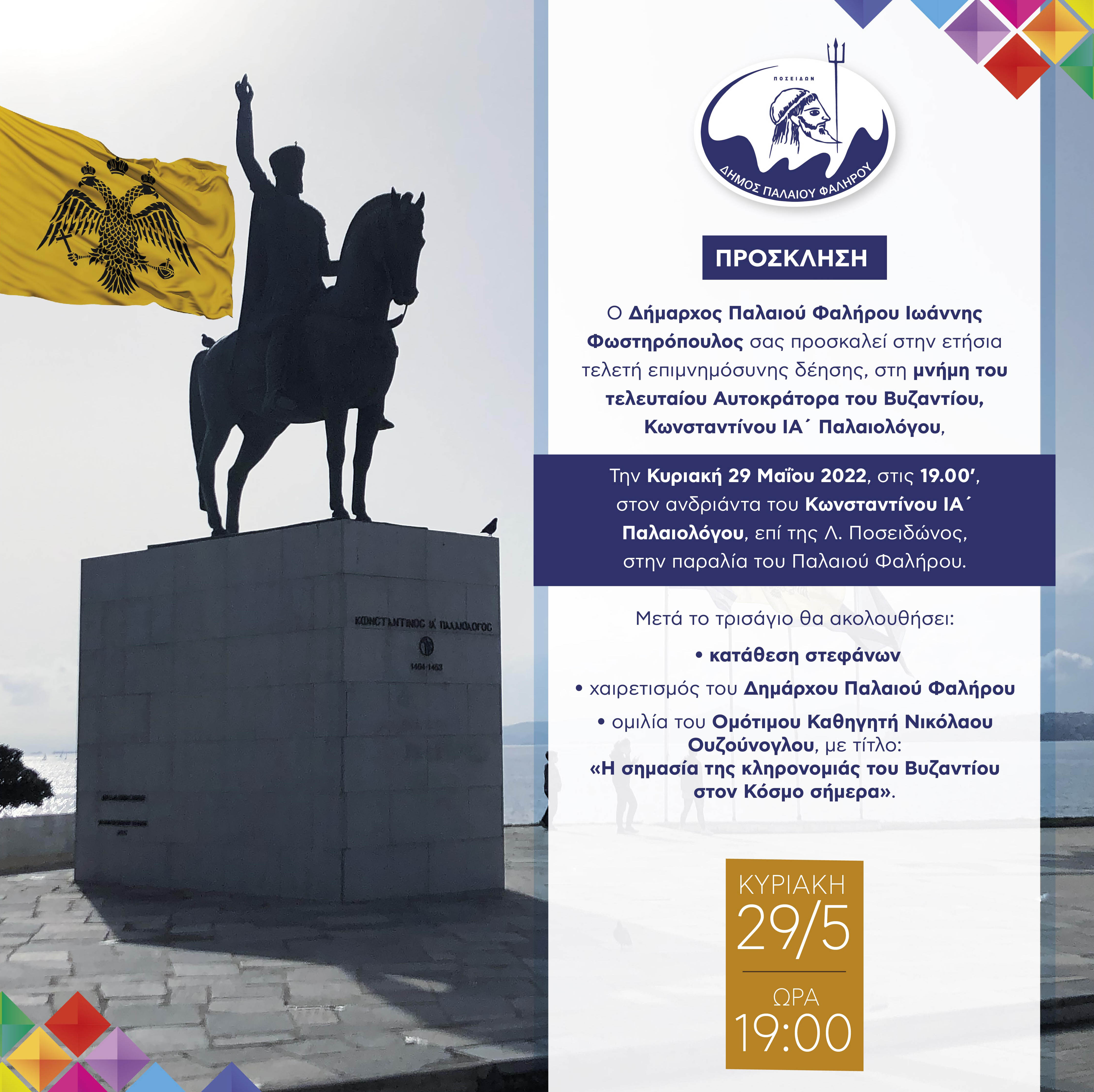Με πρωτοβουλία του Δημάρχου Παλαιού Φαλήρου, Γιάννη Φωστηρόπουλου, πραγματοποιείται την Κυριακή 29 Μαΐου, στις 19.00 το απόγευμα, η ετήσια επιμνημόσυνη δέηση στην μνήμη του τελευταίου Αυτοκράτορα του Βυζαντίου, Κωνσταντίνου ΙΑ΄ Παλαιολόγου.