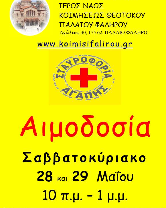 Το Σαββατοκύριακο 28 και 29 Μαΐου, ώρες 10 π.μ. έως 1 μ.μ., στο Αρχονταρίκι του Ναού, διοργανώνεται εθελοντική αιμοδοσία.