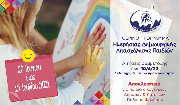 Ξεκίνησε την Τετάρτη 25 Μαΐου η υποβολή αιτήσεων για το Θερινό Πρόγραμμα Ημερήσιας Δημιουργικής Απασχόλησης 2022 του Δήμου Παλαιού Φαλήρου, για μαθητές Δημοτικού και για παιδιά που αποφοιτούν από το Νηπιαγωγείο και εντάσσονται από τη νέα σχολική χρονιά στην Πρωτοβάθμια Εκπαίδευση.