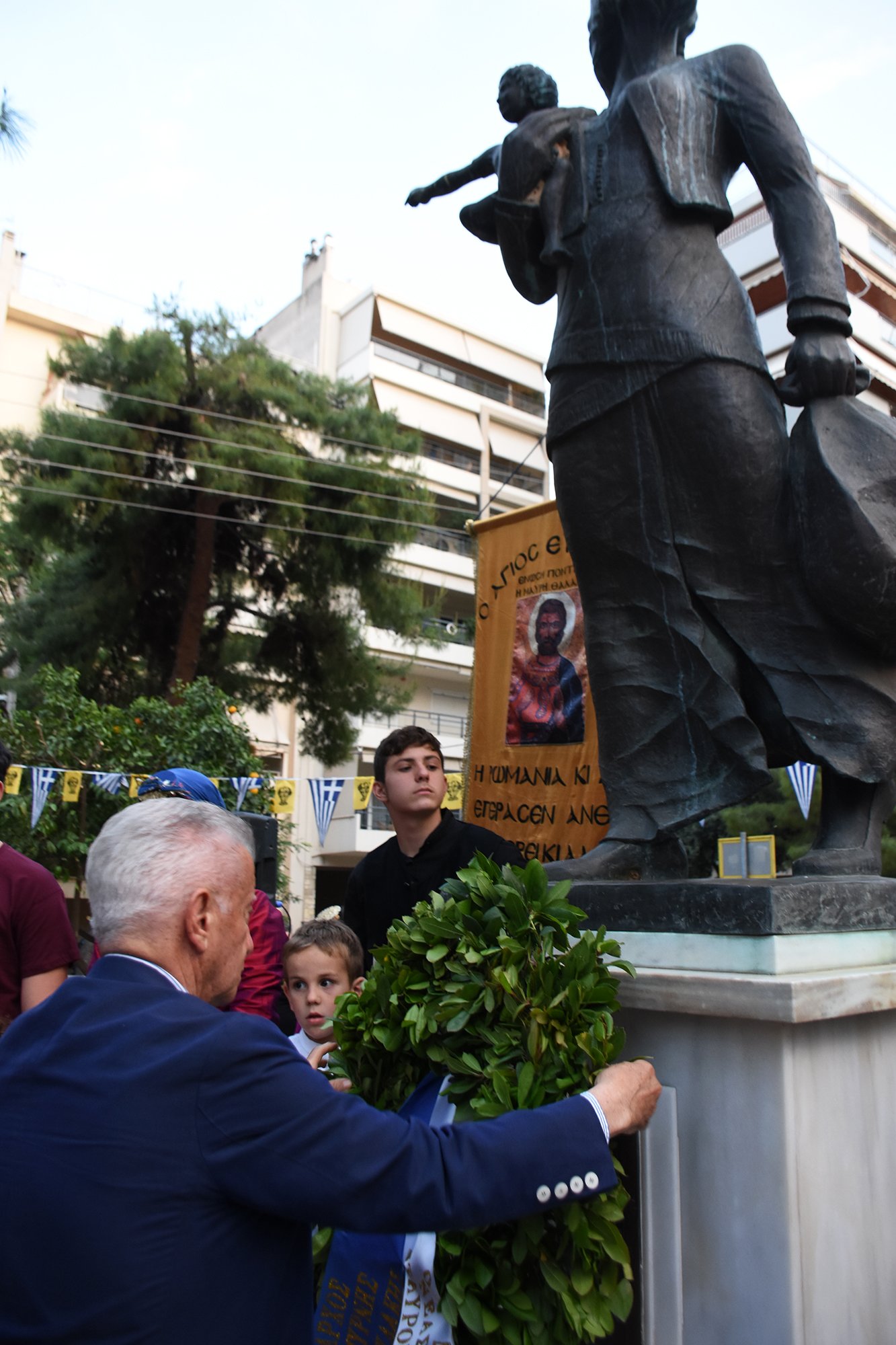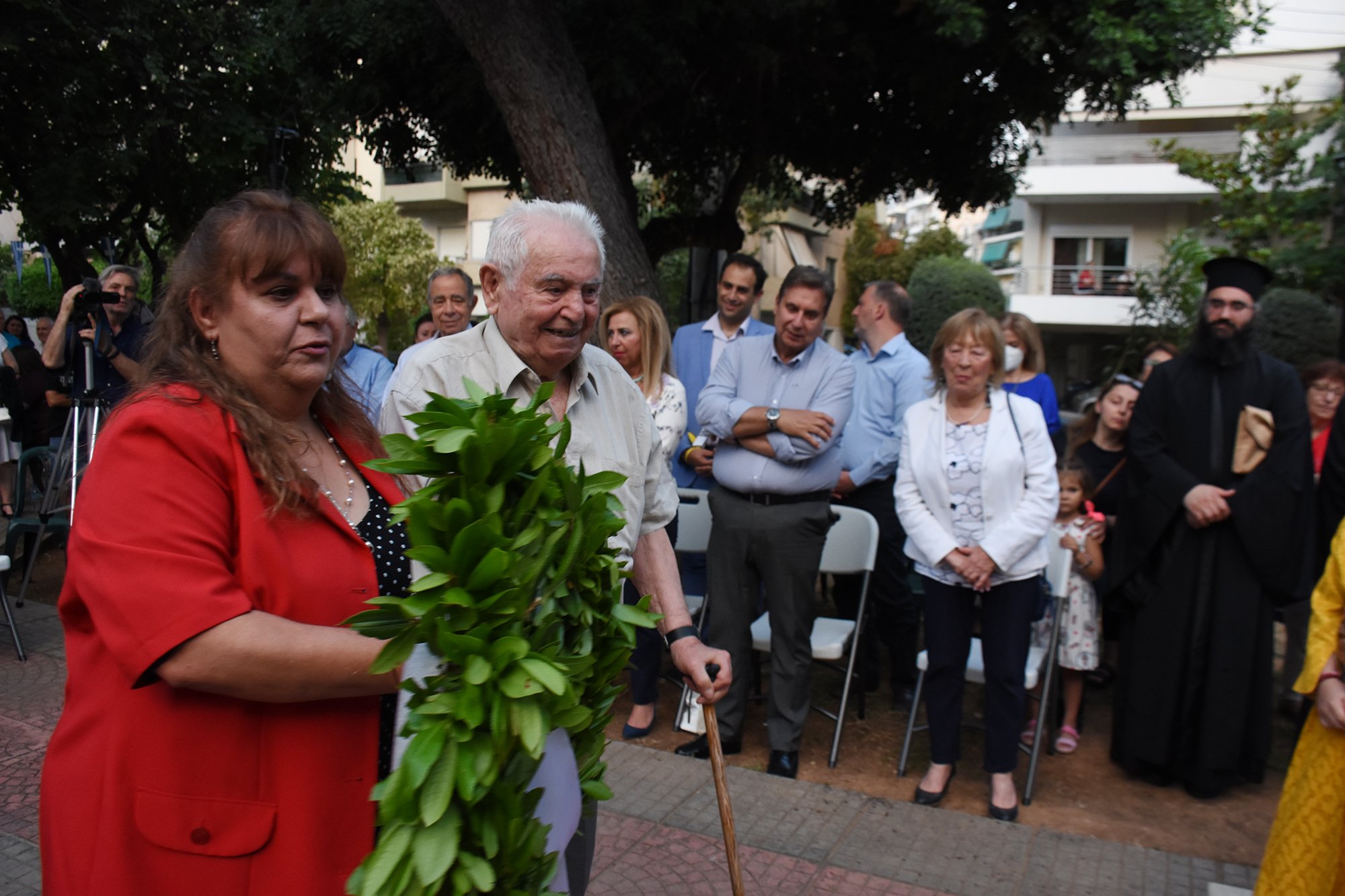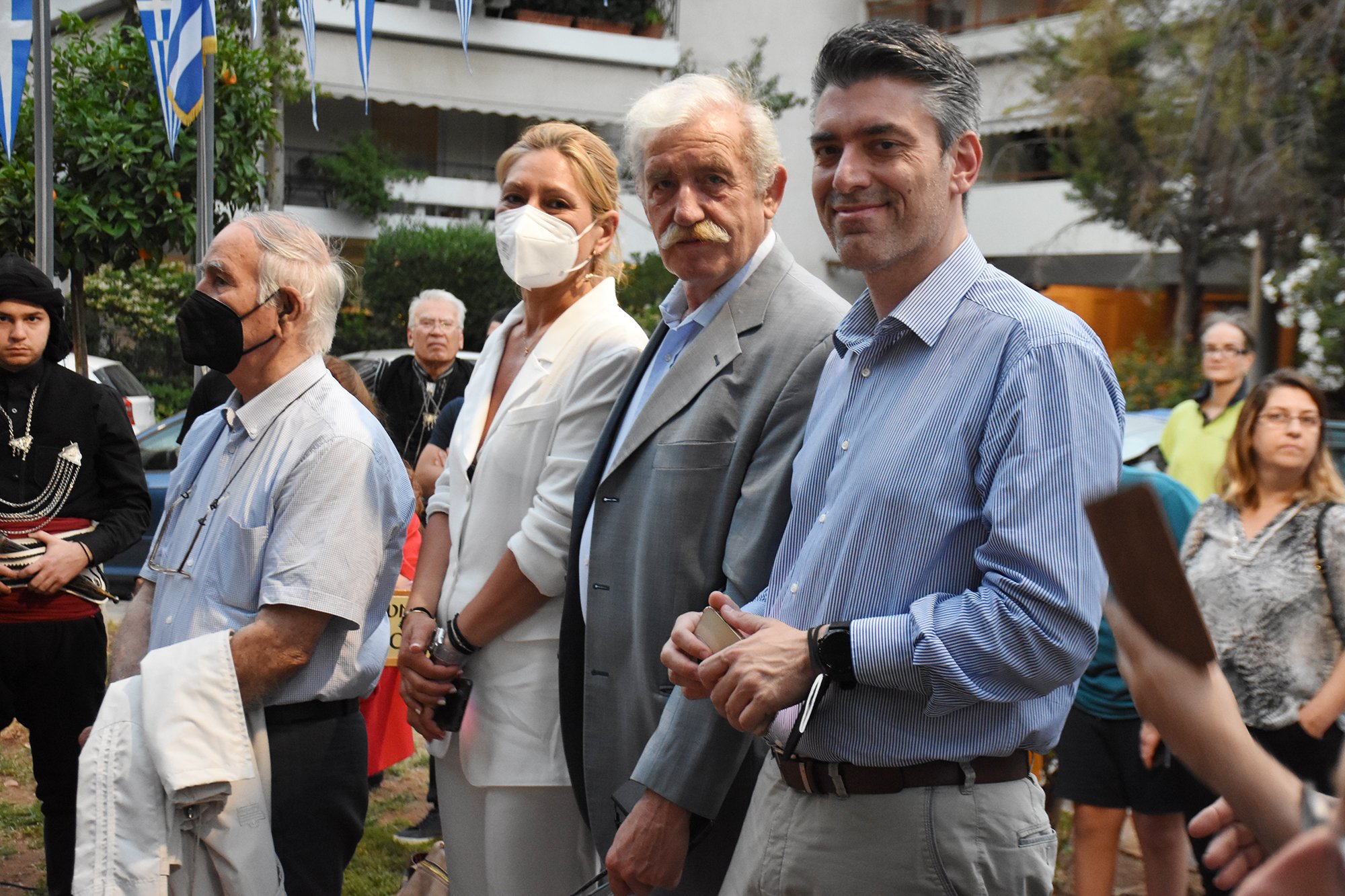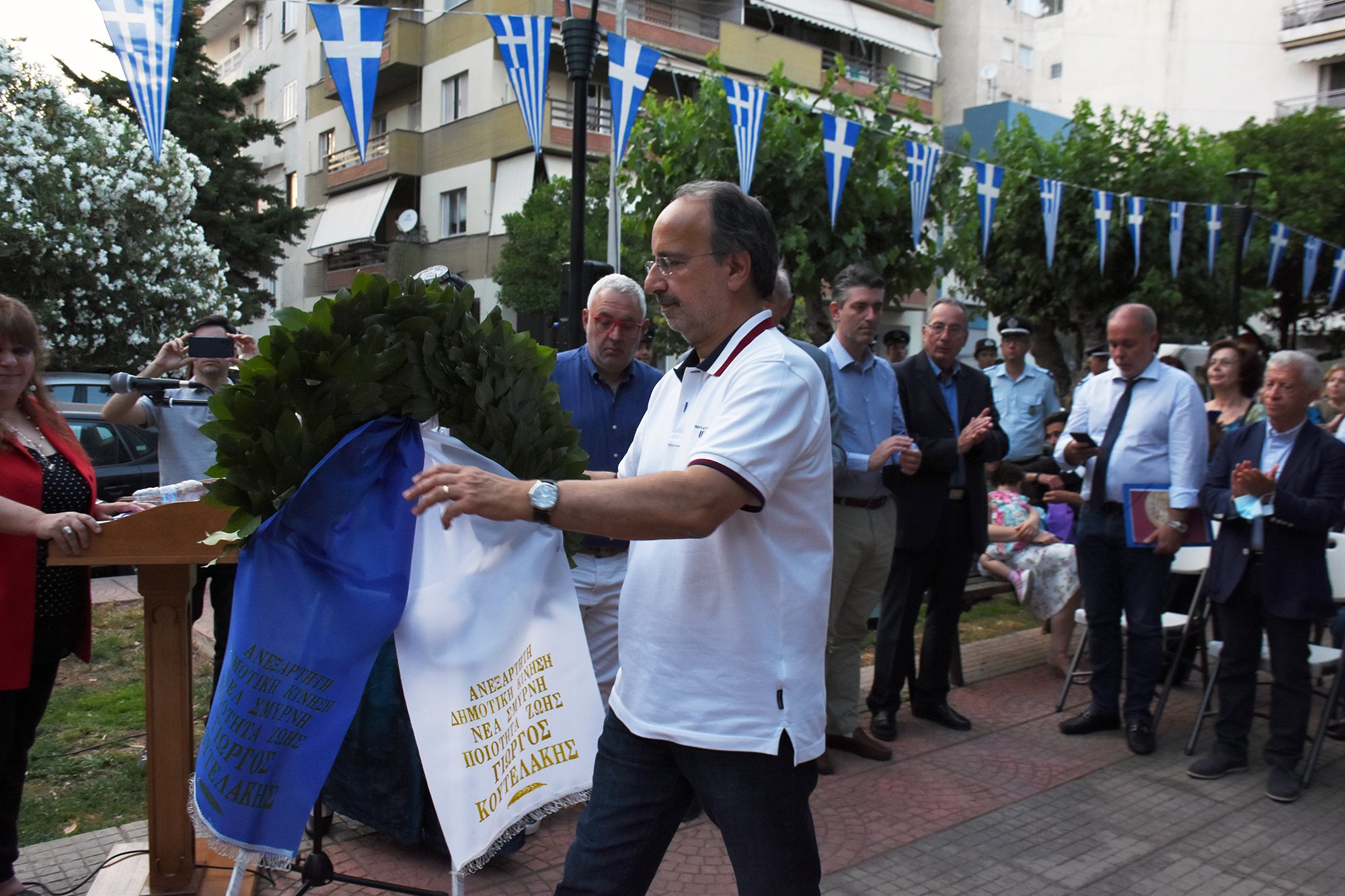 Στεφάνια κατέθεσαν ο Δήμαρχος Νέας Σμύρνης Σταύρος Τζουλάκης, η Πρόεδρος Ράνια Χρυσοχοΐδου και ο επίτιμος Αντιπρόεδρος Γιώργος Βαφειάδης για την Ένωση Ποντίων «Η Μαύρη Θάλασσα» και ο επικεφαλής της Αντιπολίτευσης του Δήμου Νέας Σμύρνης Γιώργος Κουτελάκης.