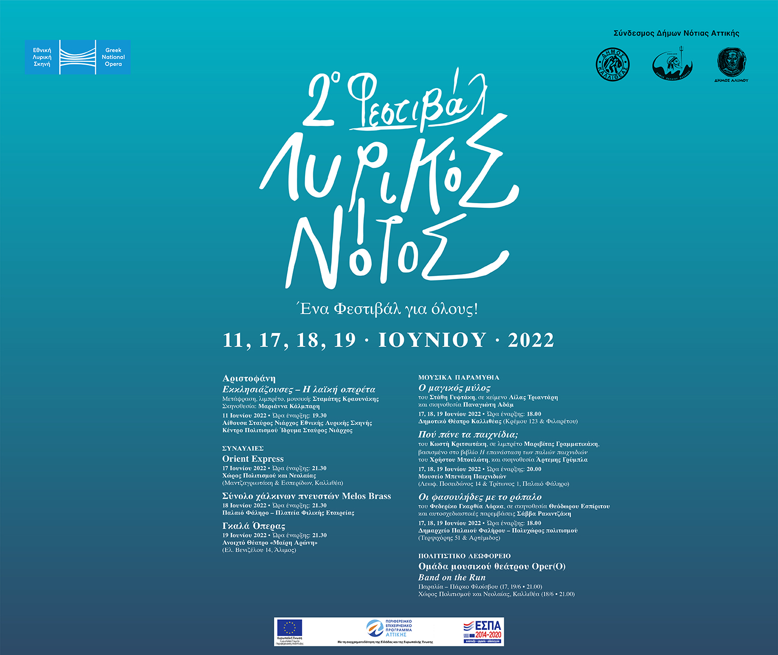 Μια πρωτότυπη λαϊκή οπερέτα, συναρπαστικά μουσικά παραμύθια για μικρούς και μεγάλους, συναυλίες για όλα τα γούστα και ένα πολιτιστικό λεωφορείο γεμάτο μουσικές εκπλήξεις φέρνει για δεύτερη χρονιά το Φεστιβάλ Λυρικός Νότος, μια συνδιοργάνωση της Εθνικής Λυρικής Σκηνής με τον Σύνδεσμο Δήμων Νότιας Αττικής – Καλλιθέα, Παλαιό Φάληρο, Άλιμος.