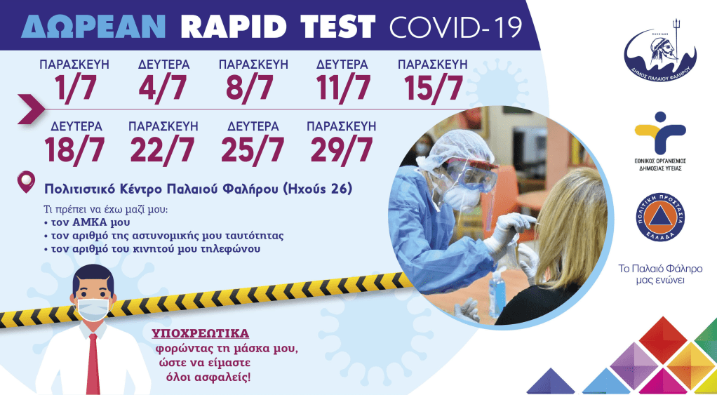 Ο Δήμος Παλαιού Φαλήρου ανακοίνωσε ότι σε συνεργασία με τον ΕΟΔΥ, έχει προγραμματίσει και θα διενεργεί δωρεάν rapid test COVID-19 κάθε Δευτέρα & Παρασκευή, όλο τον Ιούλιο, από τις 09:30΄ π.μ. έως τις 3.00΄ μ.μ., στο Πολιτιστικό Κέντρο Παλαιού Φαλήρου (επί της οδού Ηχούς 26).
