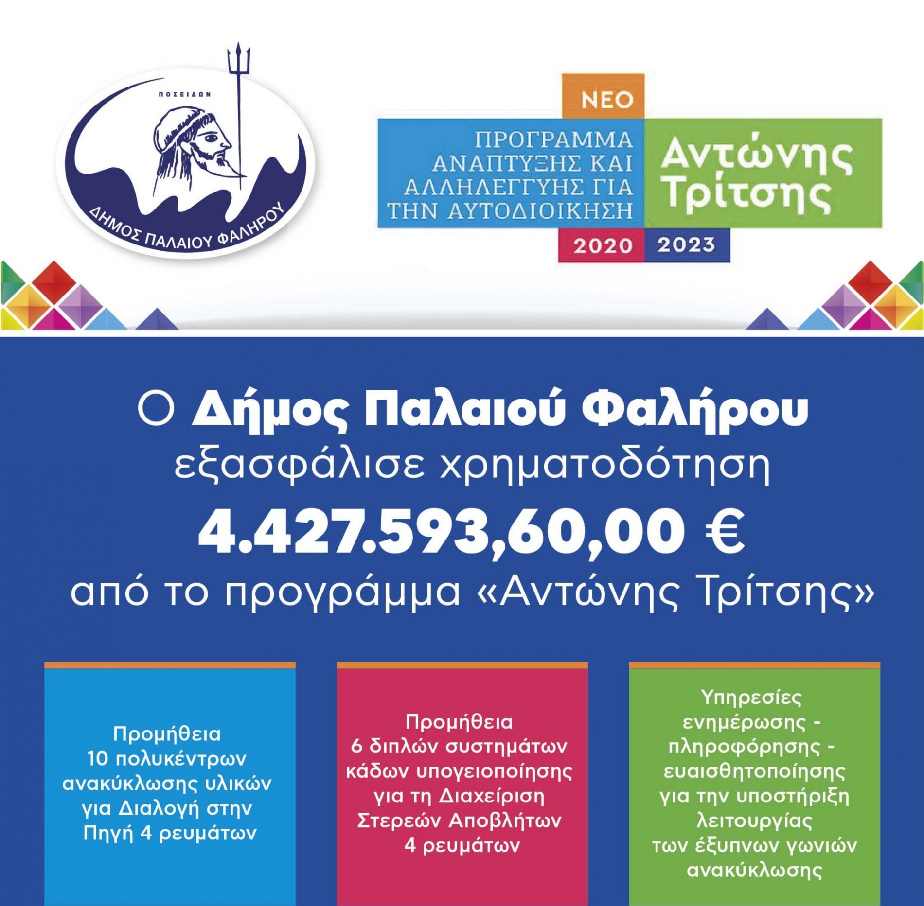 Ο Δήμος Παλαιού Φαλήρου κατάφερε, χάρη στον άρτιο σχεδιασμό, να εξασφαλίσει ακόμη μια σπουδαία χρηματοδότηση, ύψους 4.427.593€, από το πρόγραμμα «Αντώνης Τρίτσης» του Υπουργείου Εσωτερικών.