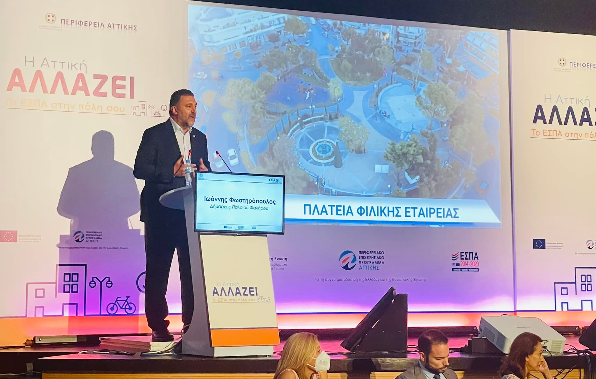 Χαιρετίζοντας την εκδήλωση ο Δήμαρχος Παλαιού Φαλήρου Γ. Φωστηρόπουλος αφού έκανε αναφορά στα μεγάλα- εμβληματικά, έργα που συγχρηματοδοτούνται από την Περιφέρεια Αττικής για την πόλη του Π. Φαλήρου, «βάσει της πορείας αξιοποίησης των πόρων του ΕΣΠΑ, του υπέρ-πολύτιμου αυτού χρηματοδοτικού εργαλείου, που αποτελεί πυλώνα ανάπτυξης, ελπίδας και προοπτικής για την Αττική» υπογράμμισε:«Μέσα από το εύρος δράσεων και παρεμβάσεων στο πλαίσιο της τριετούς πορείας υλοποίησης έργων στην Ενότητα Νοτίου Τομέα, αλλά και με πληθώρα εργαλείων ανάπτυξης μέσω των προγραμμάτων ΕΣΠΑ με το βλέμμα στο 2027, αναδεικνύονται ολοκάθαρα τα παραγωγικά αποτελέσματα της οργανωμένης, συστηματικής, δουλειάς από την Περιφέρεια Αττικής».