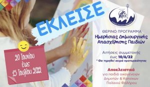 Το Θερινό Πρόγραμμα Ημερήσιας Δημιουργικής Απασχόλησης 2022 φιλοξενήθηκε από 20/6 έως 15/7/2022 σε αθλητικές και σχολικές υποδομές (10ο, 12ο &13ο Δημοτικό και 4ο Γυμνάσιο, 1ο & 3ο Λύκειο) του Δήμου μας, υπό τον συντονισμό και την οργάνωση του Γραφείου Παιδείας του Δήμου Παλαιού Φαλήρου, στο πλαίσιο της κοινωνικής πολιτικής που εφαρμόζεται και παρέχεται δωρεάν από τη Δημοτική Αρχή, αποκλειστικά για παιδιά οικογενειών δημοτών και κατοίκων Παλαιού Φαλήρου.