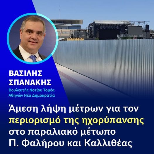 Την άμεση λήψη μέτρων για τον περιορισμό της ηχορύπανσης στο παραλιακό μέτωπο του Παλαιού Φαλήρου και της Καλλιθέας, ζητά με ερώτησή του προς τον Υπουργό Οικονομικών κ. Χρ. Σταϊκούρα, τον Υπουργό Προστασίας του Πολίτη κ. Παναγιώτη Θεοδωρικάκο και τον Υπουργό Εσωτερικών κ. Μάκη Βορίδη, ο Βουλευτής του Νότιου Τομέα Βασίλης Σπανάκης.