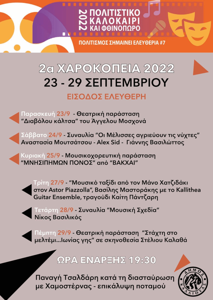 Ξεκίνησαν την Παρασκευή 23 Σεπτεμβρίου και ολοκληρώνονται την Πέμπτη 29 Σεπτεμβρίου τα 2α Χαροκόπεια, ο νέος πολιτιστικός θεσμός του Δήμου Καλλιθέας. Περιλαμβάνει πλήθος εκδηλώσεων, που πραγματοποιούνται στο βόρειο τμήμα της πόλης και συγκεκριμένα στην επικάλυψη του ποταμού, στο σημείο όπου η Παναγή Τσαλδάρη συναντά τη Χαμοστέρνας.