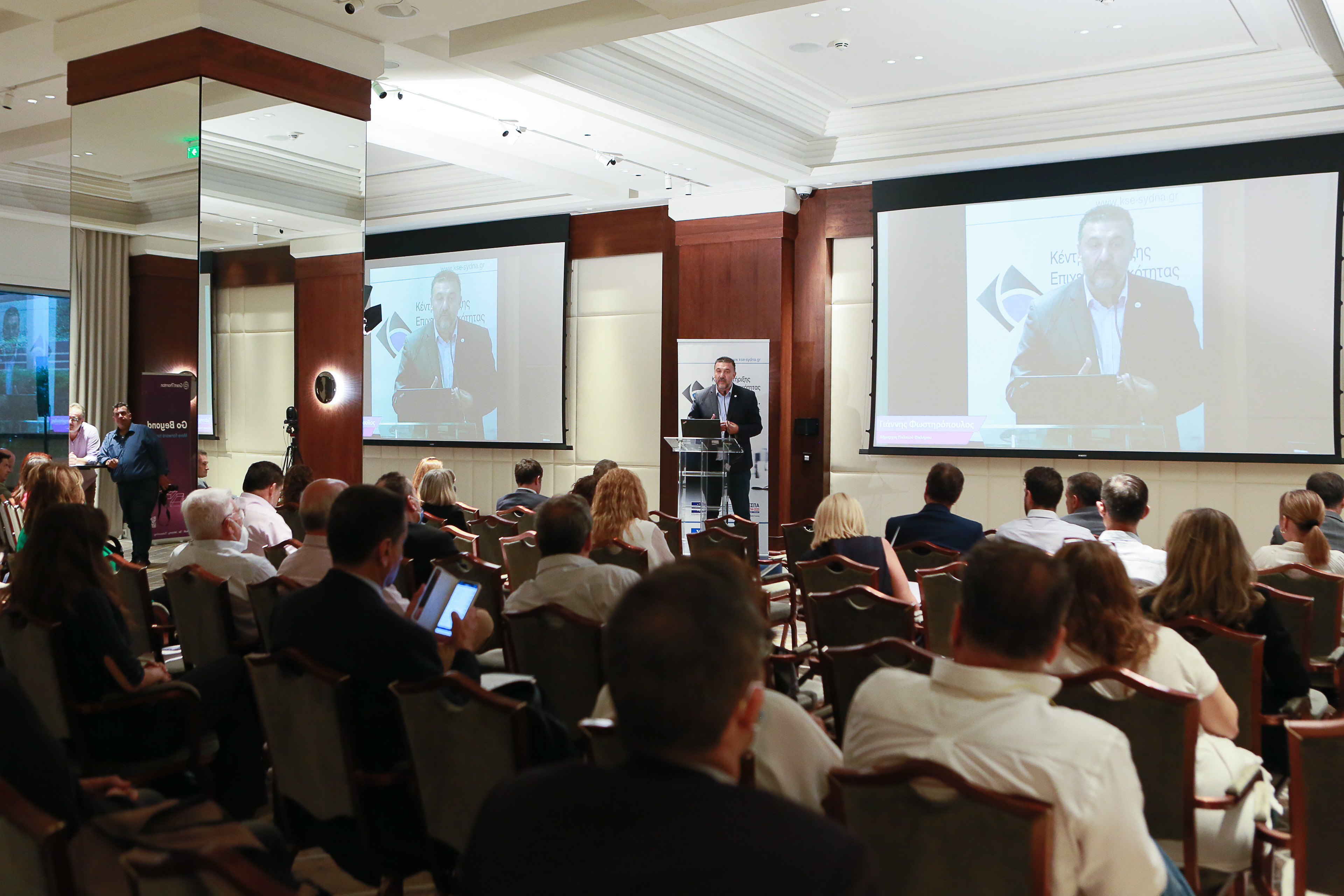 Στην κατάμεστη από επιχειρηματίες αίθουσα του ξενοδοχείου Athens Marriot Hotel, o Δήμαρχος Καλλιθέας και Πρόεδρος του ΣυΔΝΑ Δημήτρης Κάρναβος και ο Δήμαρχος Παλαιού Φαλήρου και μέλος του Δ.Σ. του ΣυΔΝΑ Γιάννης Φωστηρόπουλος, παρουσία του εκπροσώπου του Δήμου Αλίμου, Προέδρου του Δημοτικού Συμβουλίου Αλίμου, Στέφανου Διαμαντή, παρουσίασαν τις προσφερόμενες υπηρεσίες υποστήριξης των επιχειρήσεων από το Κέντρο Επιχειρηματικότητας του Συ.Δ.Ν.Α., τις δράσεις στήριξης της επιχειρηματικότητας καθώς και τα αποτελέσματα σχετικών ερευνών που ήδη έχουν ολοκληρωθεί και περιγράφουν το τοπίο και την κατάσταση της αγοράς.