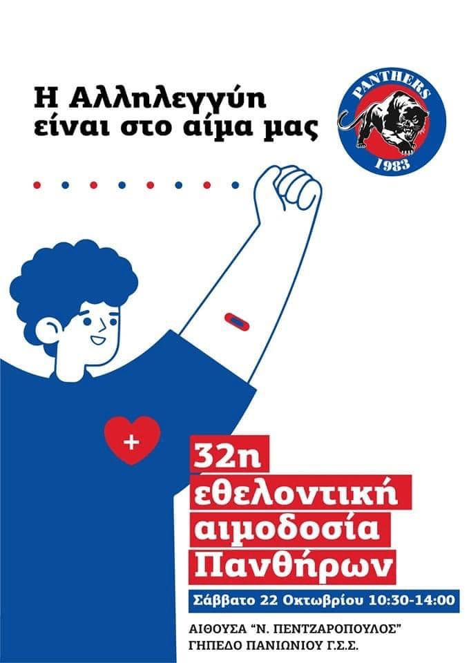 Το Σάββατο 22 Οκτωβρίου θα πραγματοποιηθεί η 32η Εθελοντική Αιμοδοσία που διοργανώνουν οι οργανωμένοι φίλοι του Πανιωνίου «Πάνθηρες».
