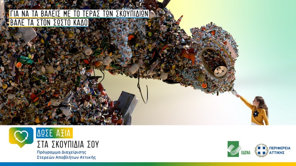 Αυτό το τέρας των σκουπιδιών μπορούμε να το νικήσουμε και την εξέλιξη της προσπάθειας για να πετύχουμε το στόχο αυτό, επιχειρεί να αναδείξει με ένα συμβολικό τρόπο αλλά και με πρακτικές οδηγίες, η δεύτερη φάση της καμπάνιας ενημέρωσης και ευαισθητοποίησης , που υλοποιείται από τον Ειδικό Διαβαθμιδικό Σύνδεσμο Νομού Αττικής (ΕΔΣΝΑ) και την Περιφέρεια Αττικής.