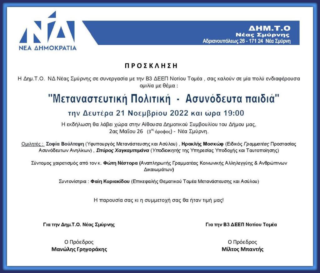 Τη Δευτέρα 21 Νοεμβρίου η ΔΗΜ.ΤΟ ΝΔ Νέας Σμύρνης και η Β3 ΔΕΕΠ ΝΔ Νοτίου Τομέα, σε συνεργασία με το Υπουργείο Μεταναστευτικής Πολιτικής και Ασύλου, διοργανώνει πολιτική εκδήλωση με Θέμα » Μεταναστευτική Πολιτική – Ασυνόδευτα Παιδιά» με αφορμή το τεράστιο κοινωνικό και ηθικό πρόβλημα των ασυνόδευτων παιδιών των ανεξέλεγκτων μεταναστευτικών ροών προσφύγων,