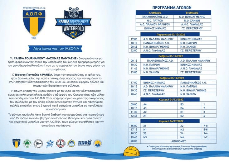 To 3ο PANDA TOURNAMENT «ΙΑΣΟΝΑΣ ΠΑΝΤΑΖΗΣ» διοργανώνεται για 3η συνεχή χρονιά από τον Αθλητικό Όμιλο Παλαιού Φαλήρου, εις μνήμη Ιάσoνα Πανταζή, με αφορμή την συμπλήρωση 4 χρόνων από την τραγική απώλεια του ταλαντούχου Φαληριώτη αθλητή της υδατοσφαίρισης και του Α.Ο.Π.Φ., σε τροχαίο δυστύχημα.